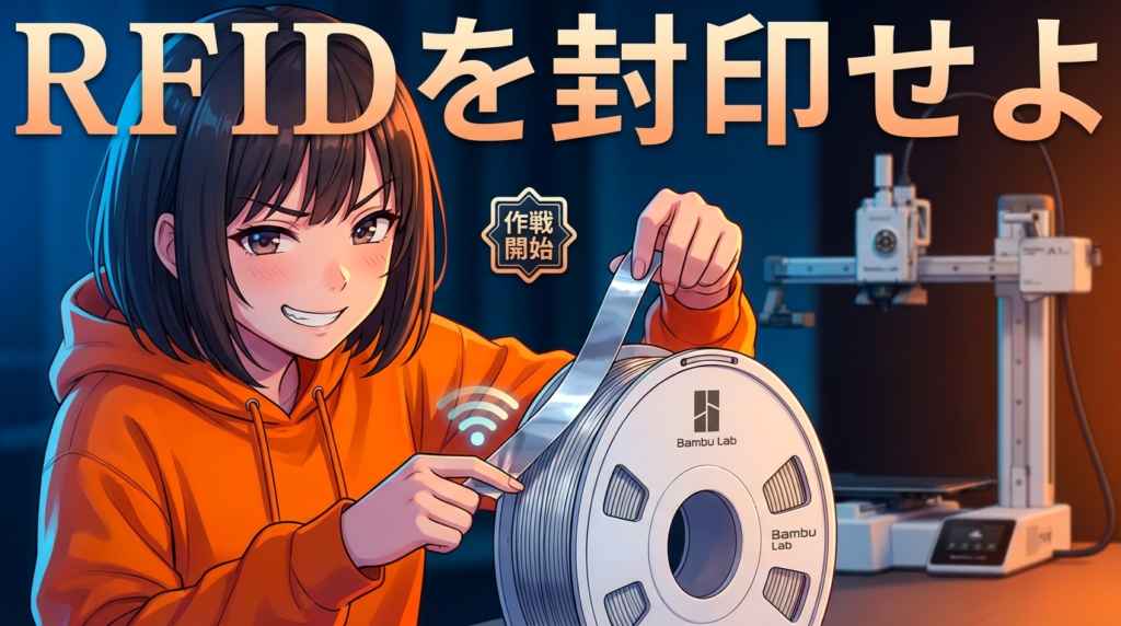 Bambu純正スプールの場合、スプール側面のRFIDタグを剥がすか、アルミテープで覆って読み取りを遮断します。これでプリンターは「不明なスプール」として扱い、手動設定を受け入れるようになります。