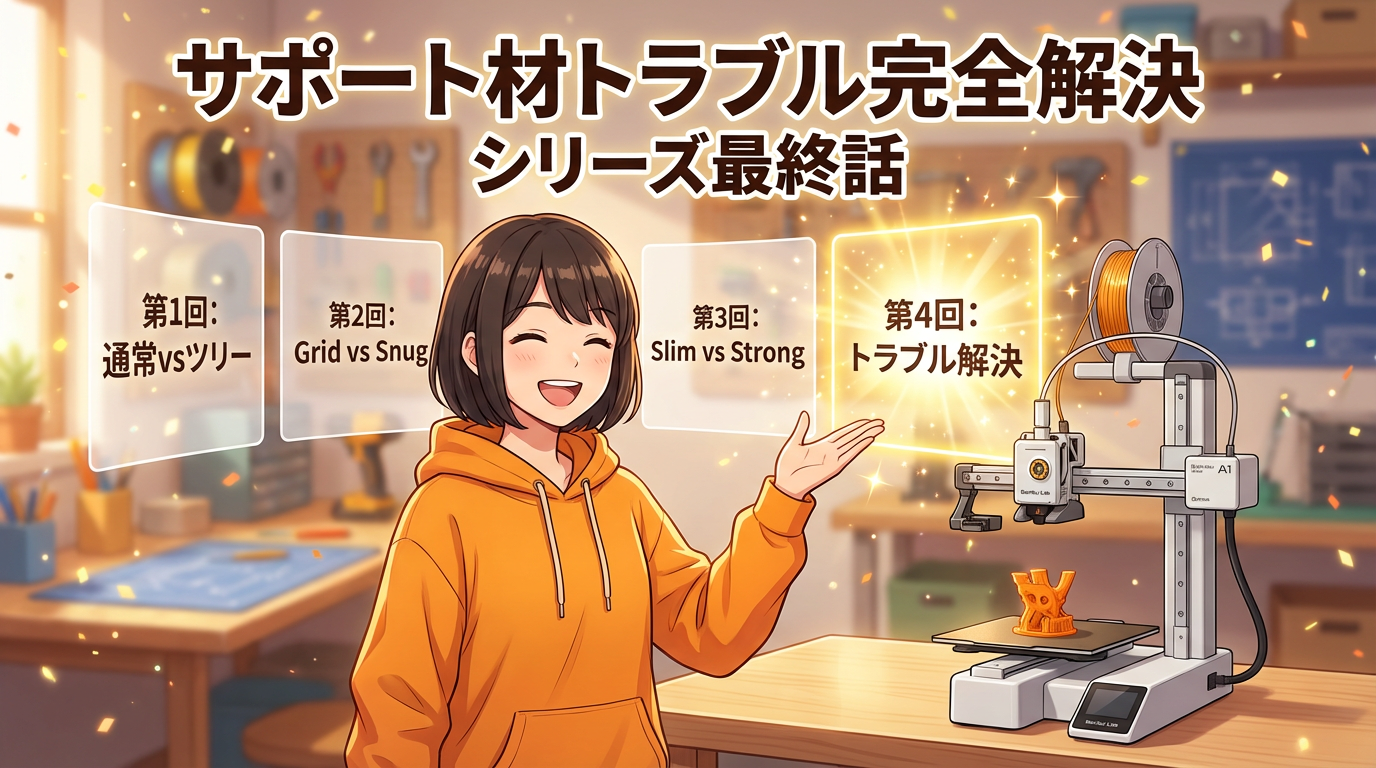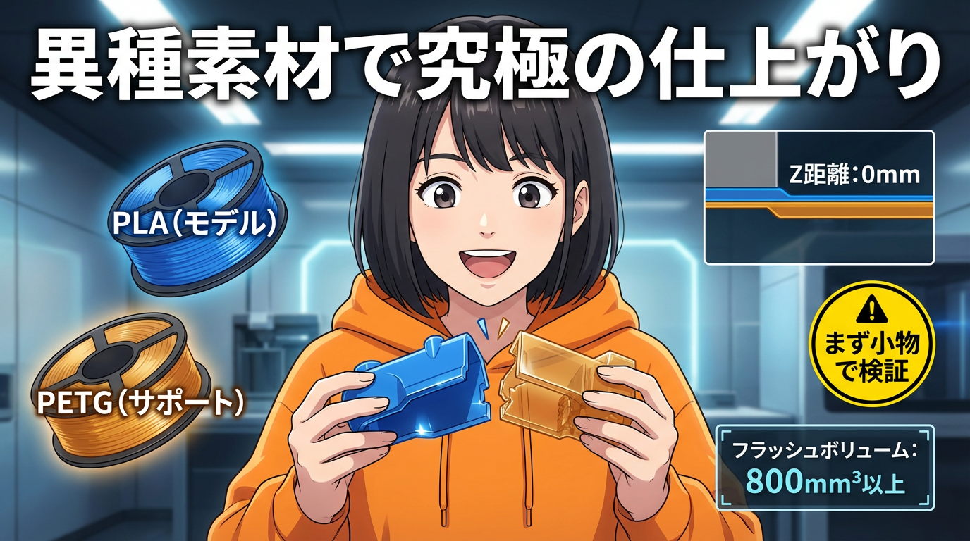究極ã®ä»äžãããæ±ãããªããPLAã¢ãã«ã«PETGãµããŒããçžäºã®æ¥çã匱ãã®ã§ãæ¡ä»¶ãåãã°Zè·é¢0mmã§ãå¥ãããããšãå€ãã§ããåºé¢ã¯ãã«ãã«ã«ä»äžãããŸãã