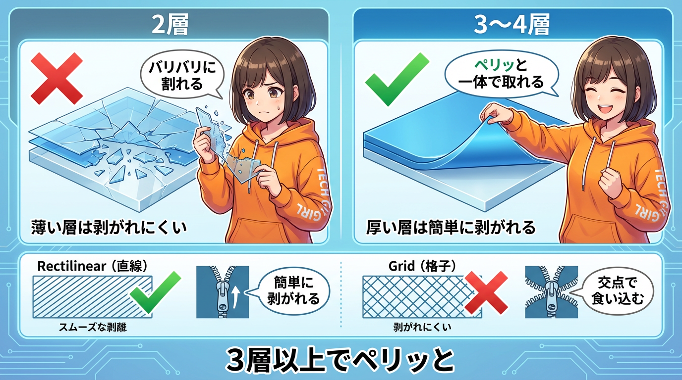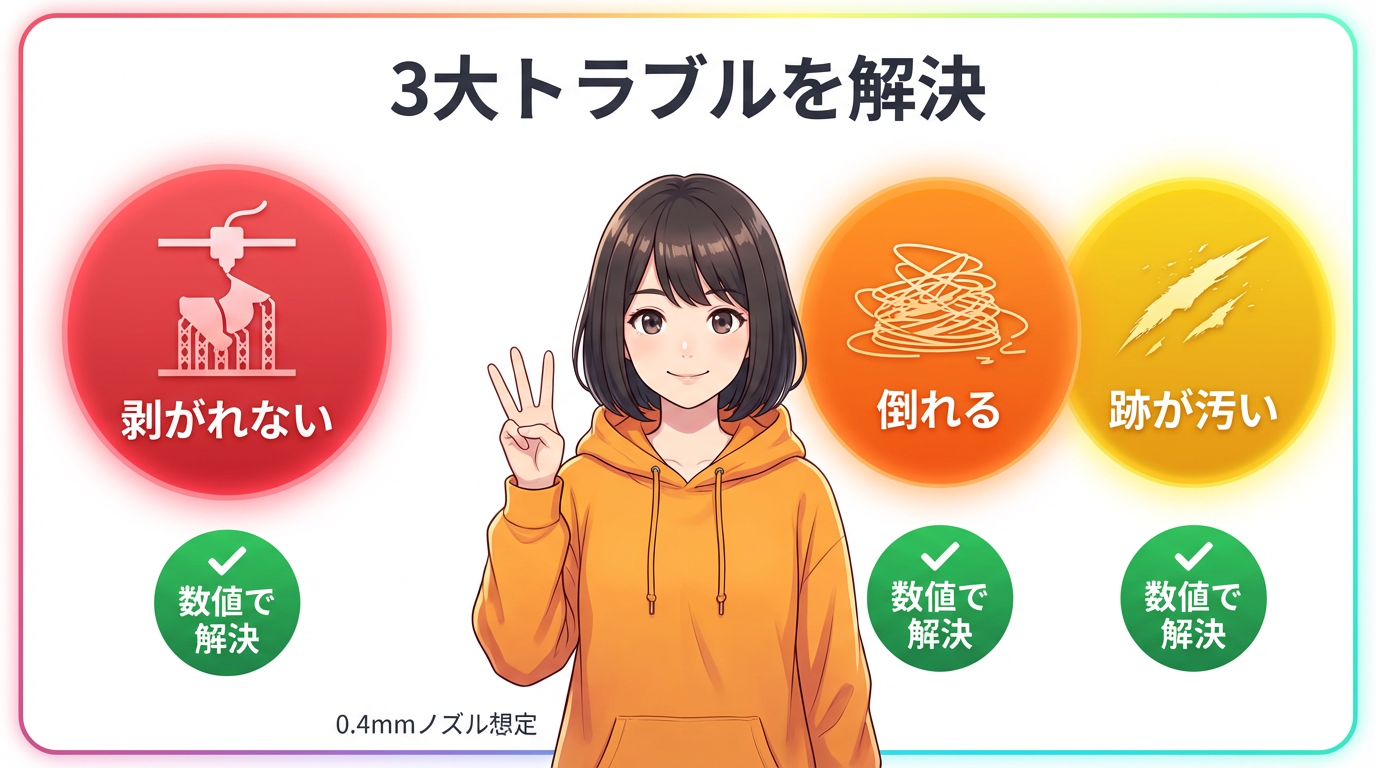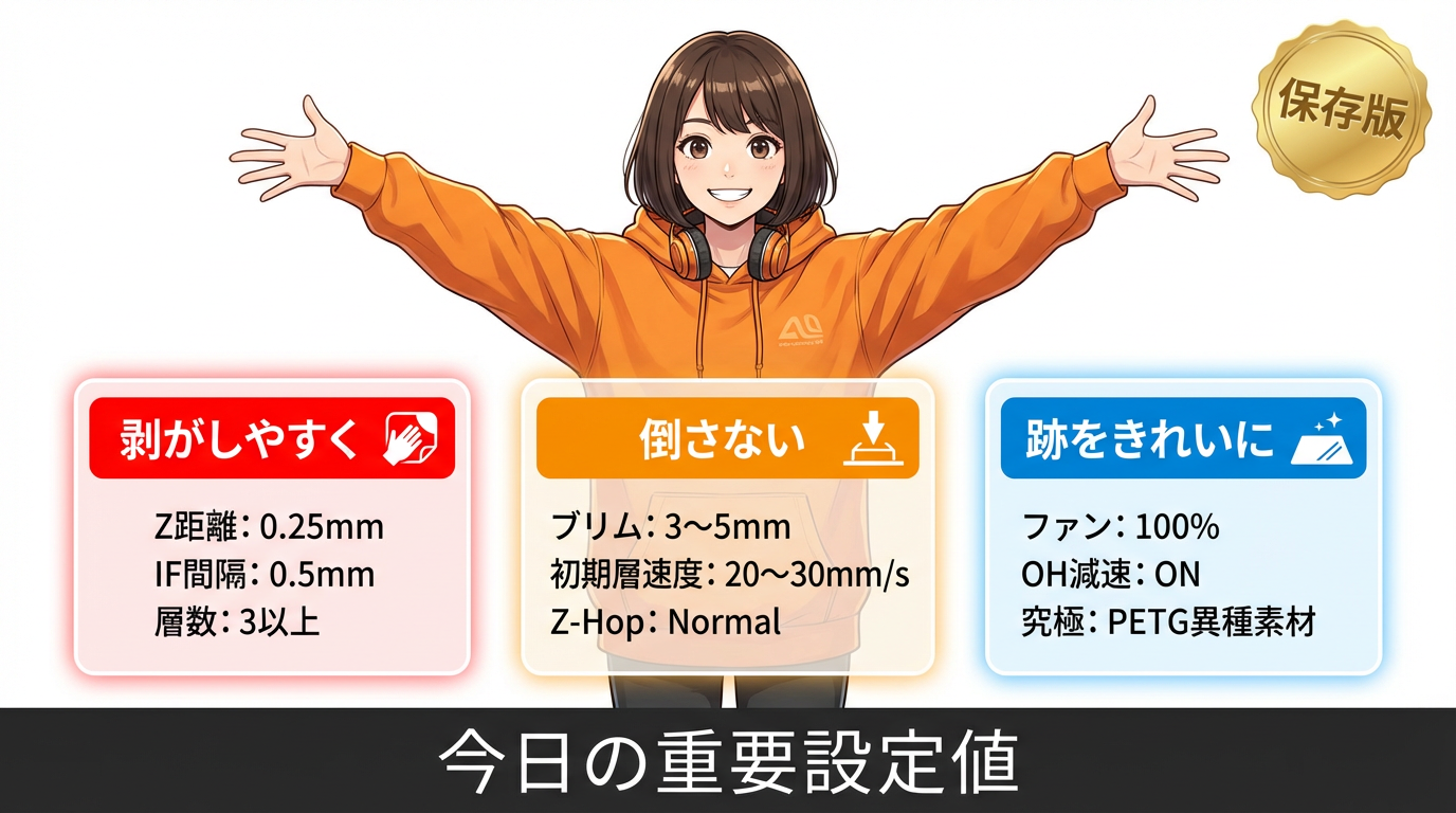 åºæ¬ã®æšå¥šå€ã¯0.2mmãå¥ãããããããããªã0.25mmã«ããã£ã0.05mmã§åçã«å€ãããŸããéã«0.16mm以äžã¯ãPETGã ãšèçãªã¹ã¯å€§ã§ãã