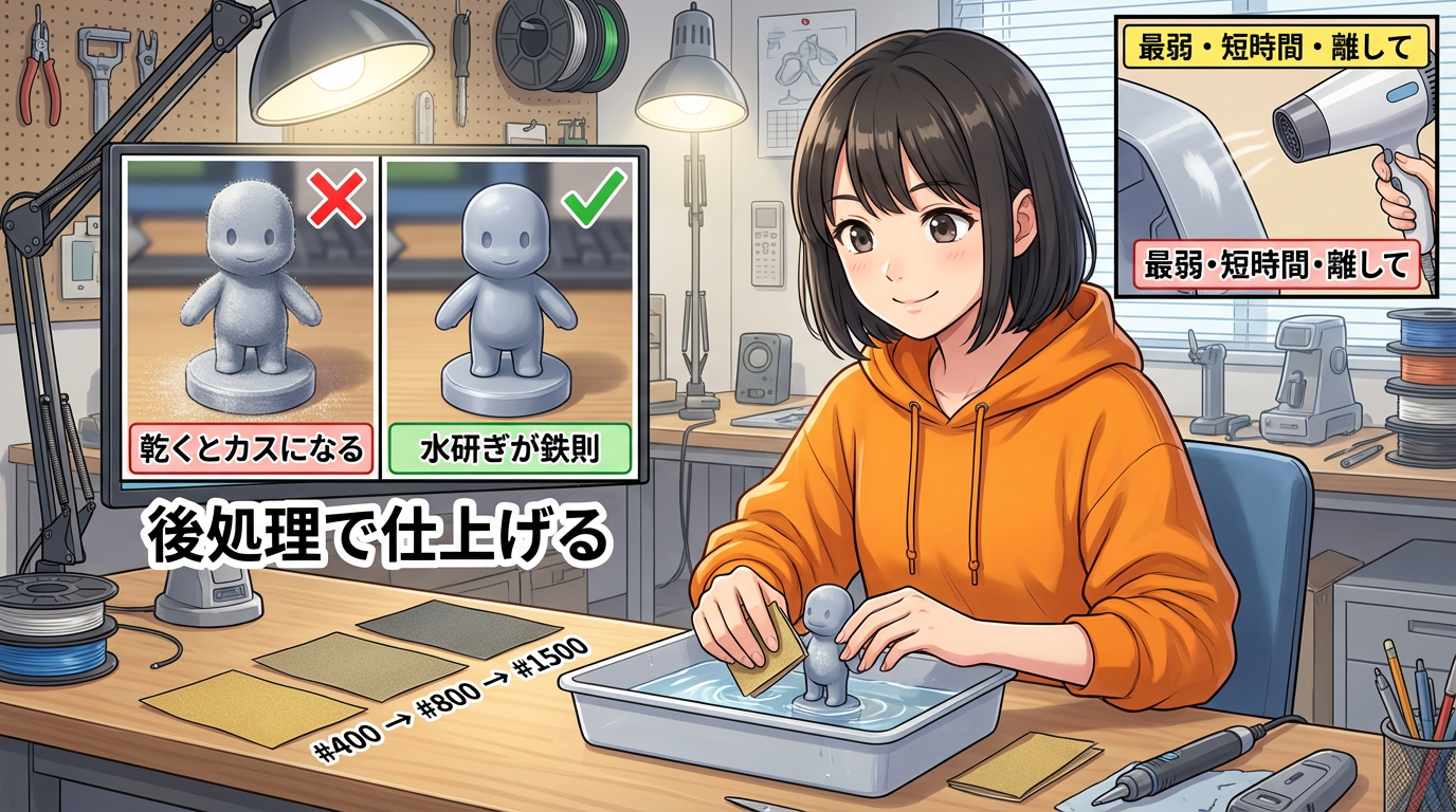 PLAã®ç 磚ã¯å¿ ããæ°Žç ããã§ã也ããç¶æ ã ãšæ©æŠç±ã§æº¶ããŸããèæ°ŽããŒããŒã§#400â#800â#1500ã®é ã