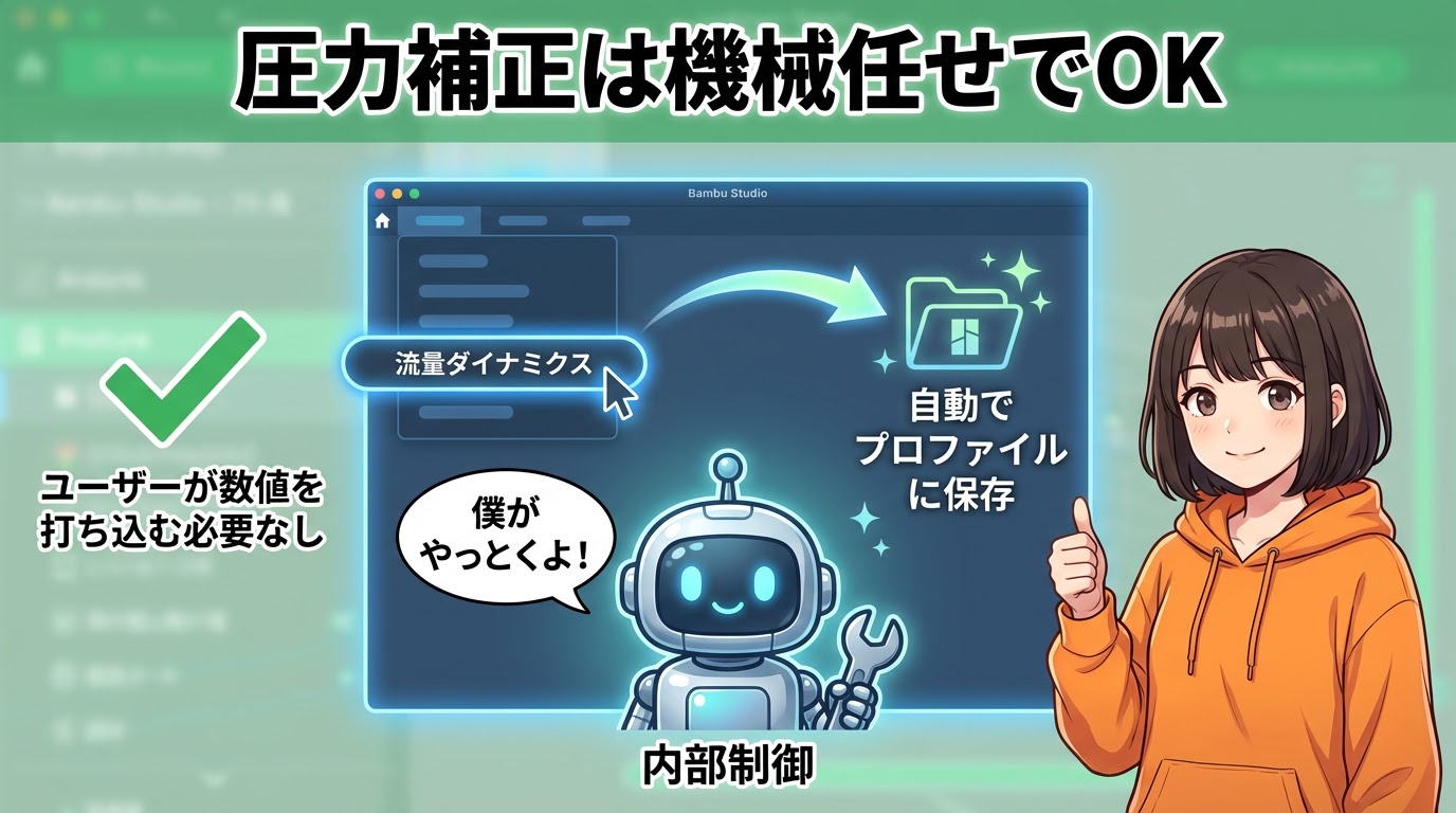 Bambu Studioでは、圧力補正は基本的に「内部制御」されていて、ユーザーが数値を直接いじる項目はありません。