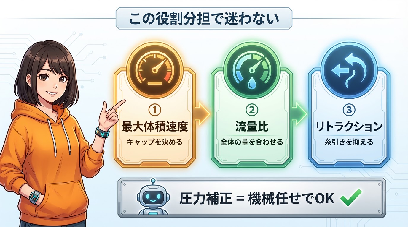 ③ リトラクション → 「糸引きを抑える」(移動中の漏れを防ぐ)