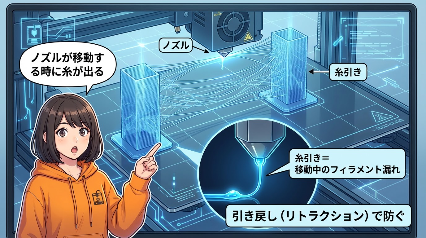 ノズルが移動する時に、溶けたフィラメントが糸のように伸びる現象です。これを防ぐのが「引き戻し」(リトラクション)設定ですね💡