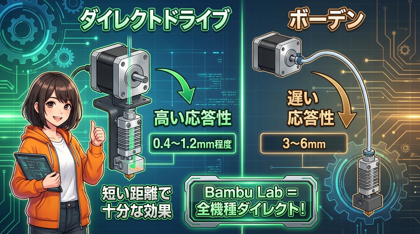 ダイレクトドライブはエクストルーダーモーターがノズル直上にあるため、フィラメントの制御応答性が高いんです。だから短い距離で十分!✨