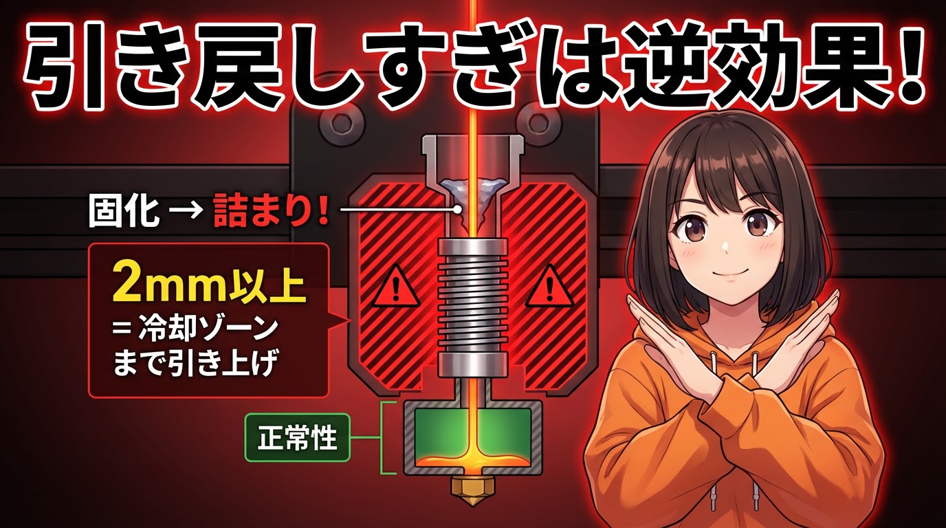 2mm以上に設定すると、溶けたフィラメントが冷却ゾーンまで引き上げられて固まり、「詰まりの原因」になります😱