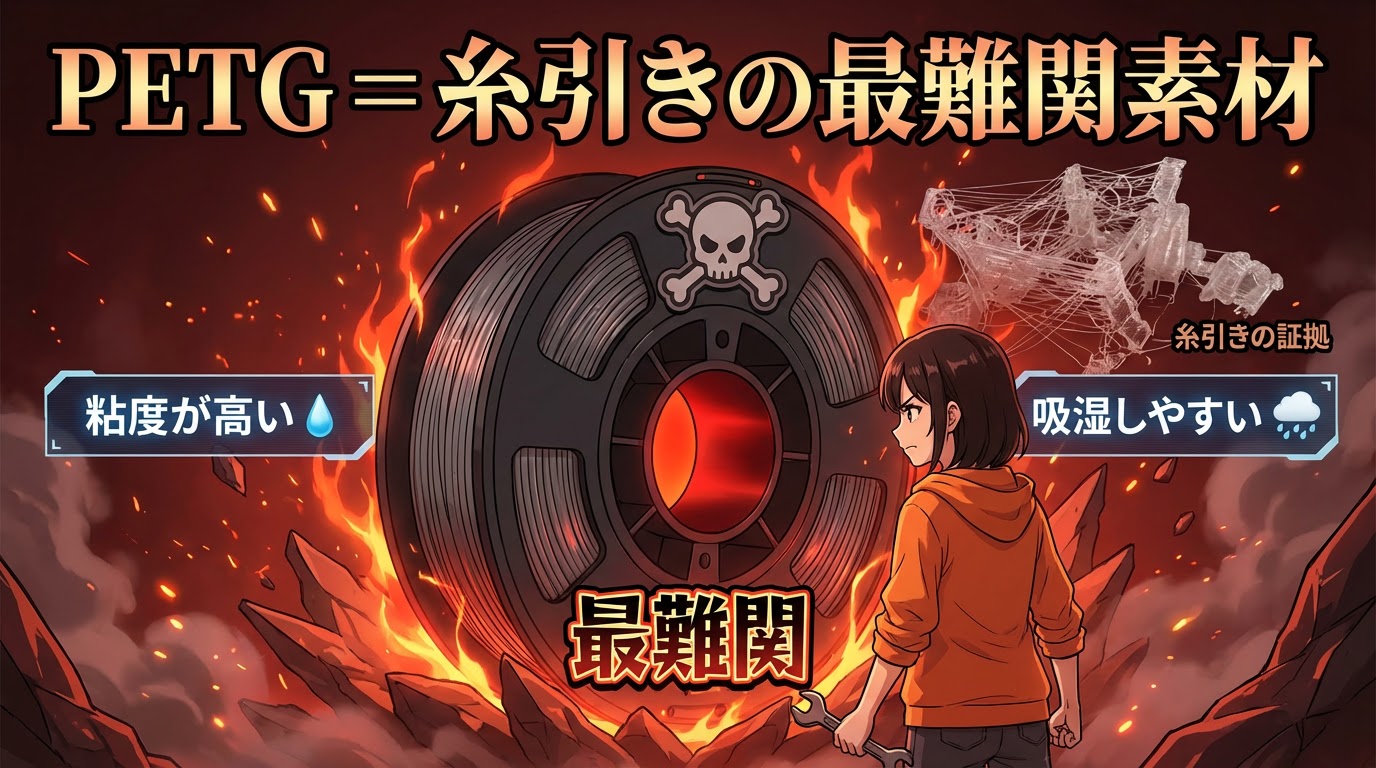 PETGは粘度が高くて、しかも吸湿しやすい。糸引きが発生しやすい「最難関」素材です💦