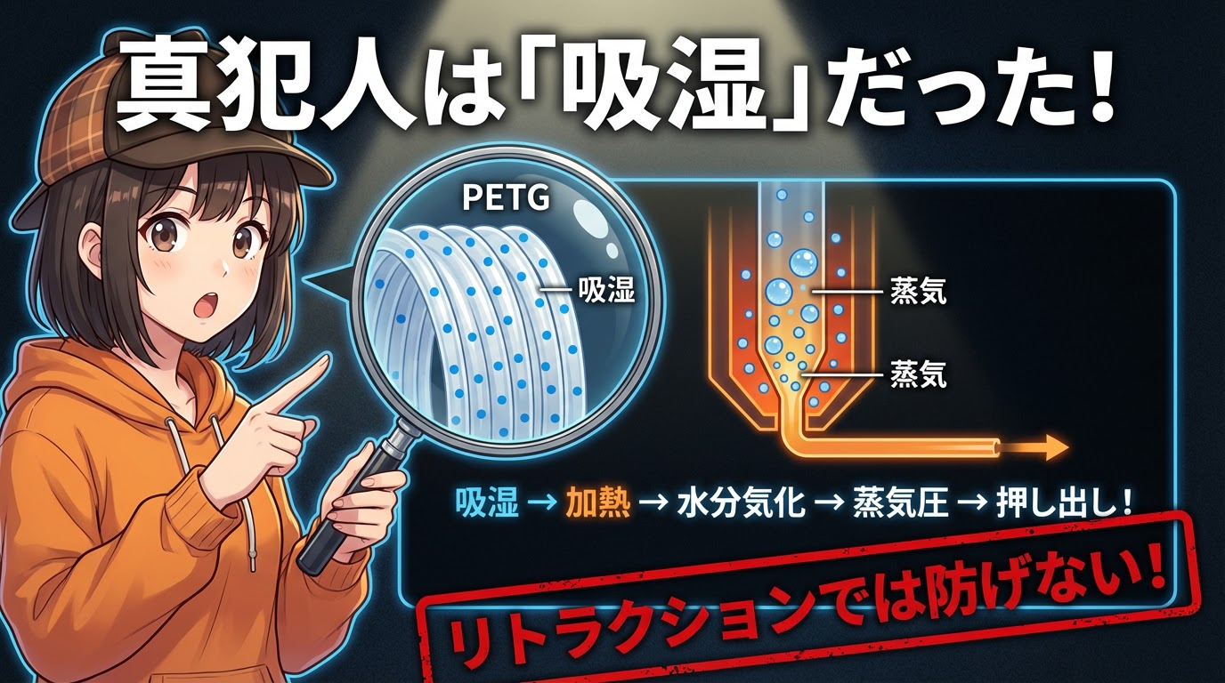 PETGは空気中の水分を吸います。その状態で加熱すると、内部で水分が気化して蒸気圧でフィラメントを押し出してしまう。