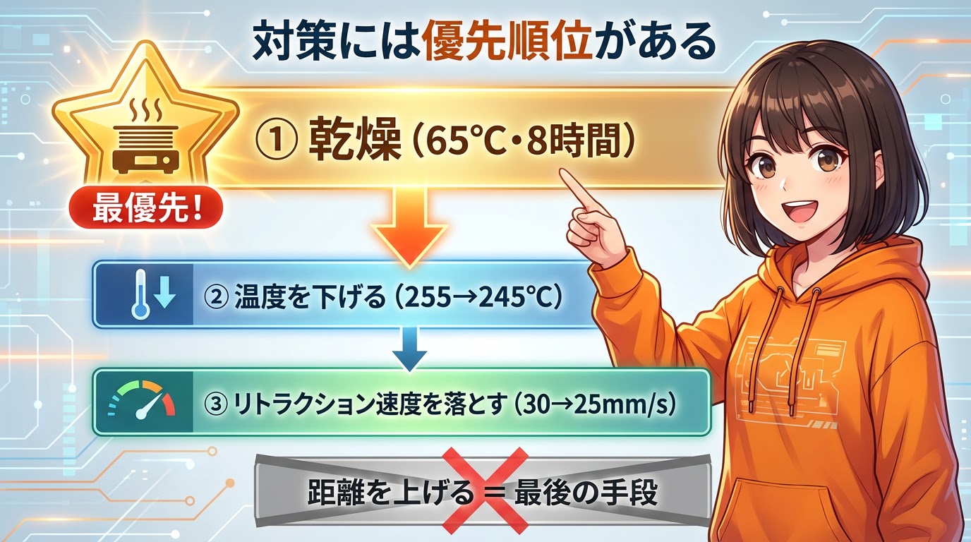 ① 【最優先】フィラメント乾燥 → 65℃で8時間以上。まずはコレ!