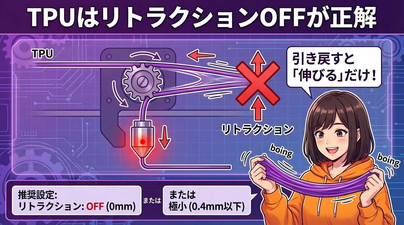 TPUはゴムのように弾性があるため、引き戻すと「伸びる」だけでノズル先端の圧力が下がりません。