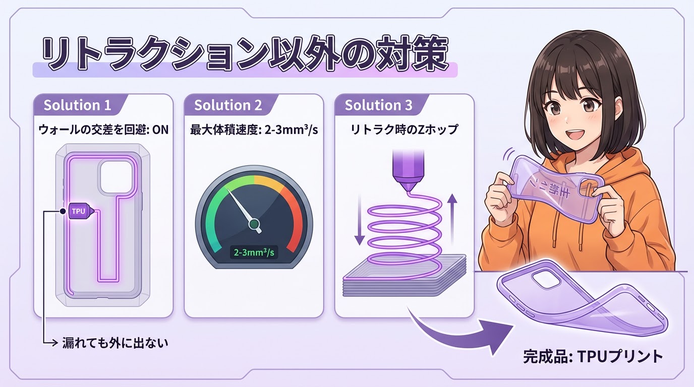 ② 【TPU】リトラクションは「OFF」。代わりに「ウォールの交差を回避」と低速で対応