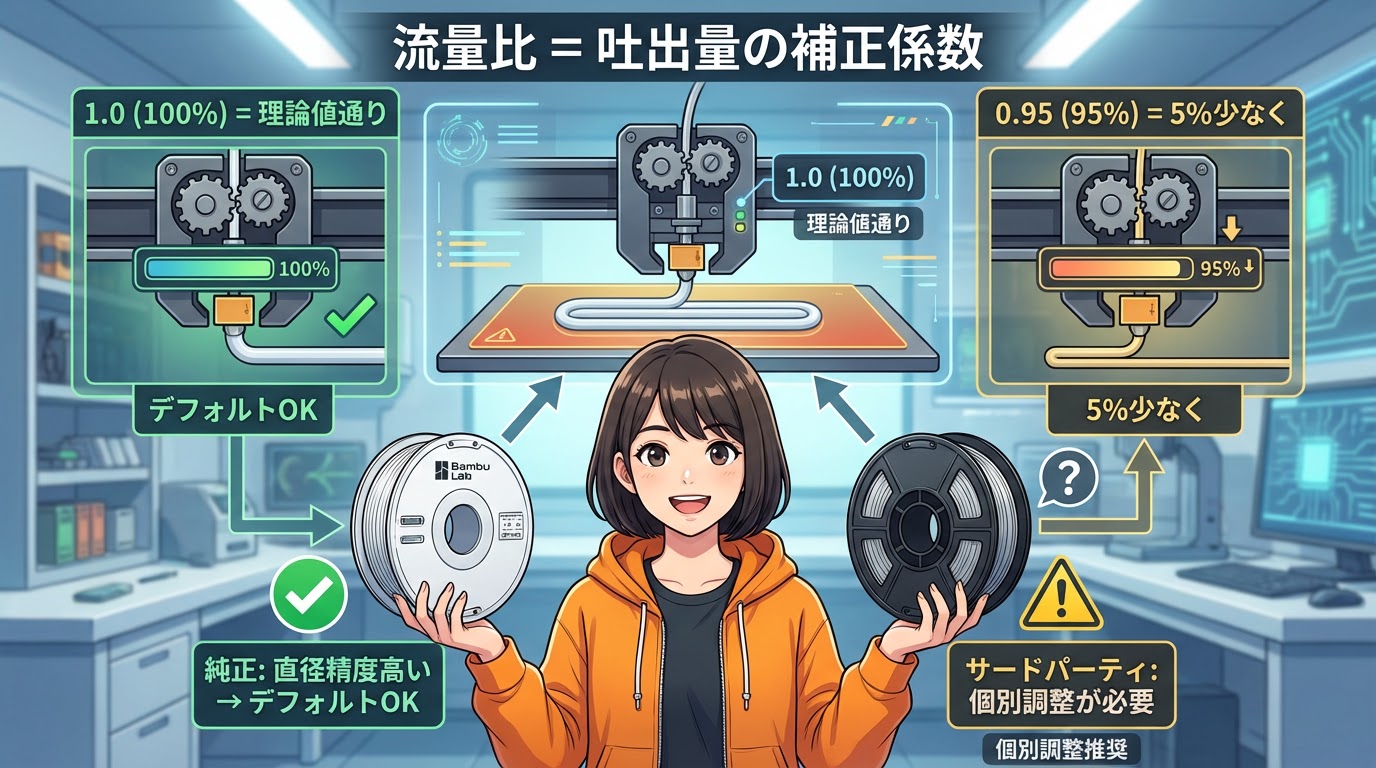 流量比は、スライサーが計算した理論上の吐出体積に対する補正係数です。