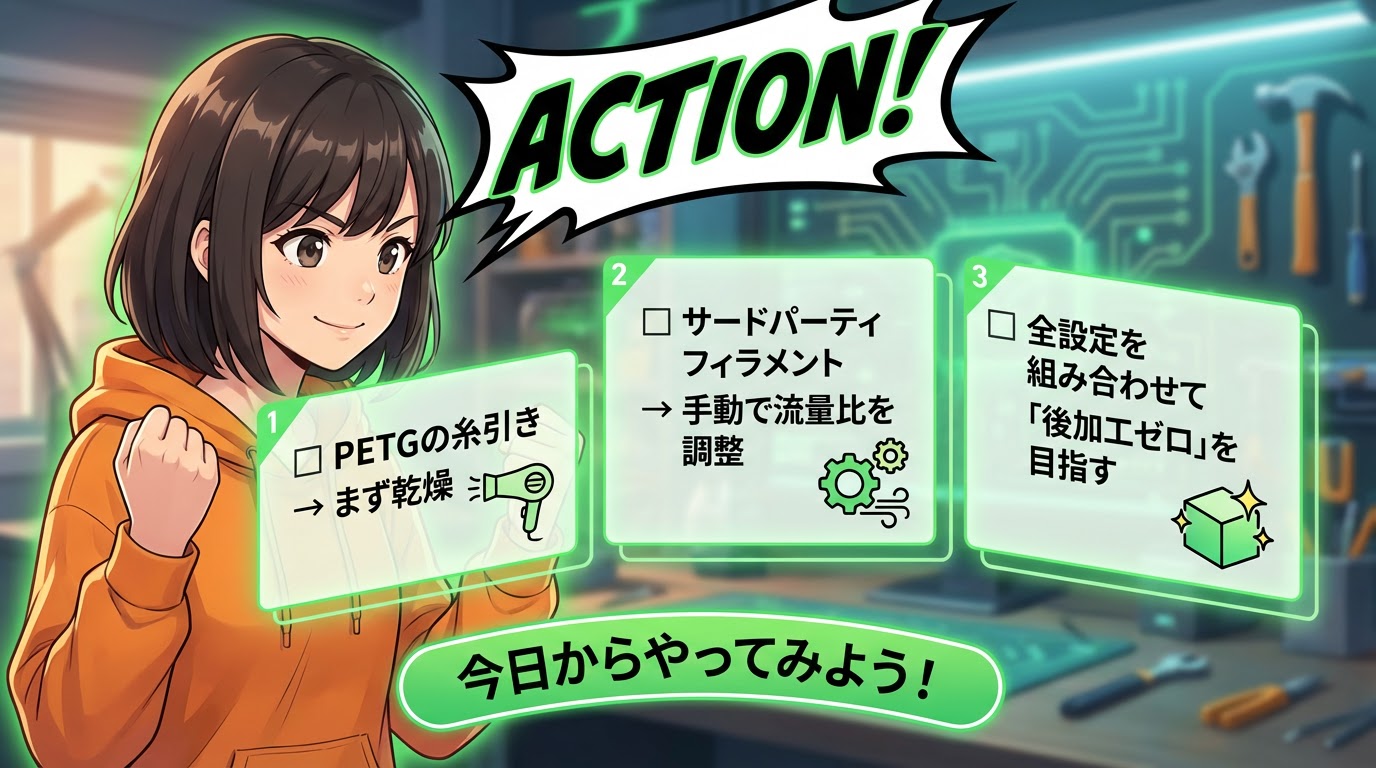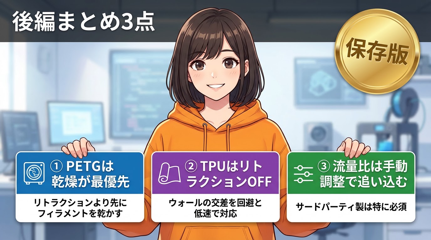 | PETG対策優先順位 | Scene/011.jpg | Slide 111 | 乾燥→温度→速度の順 |