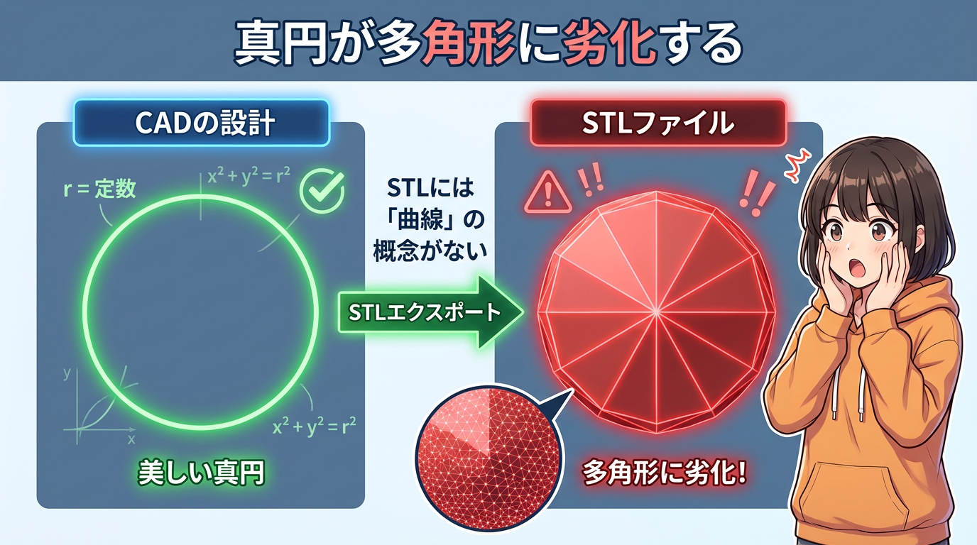STLには「曲線」の概念がありません。すべて平面の三角形で表現される。だから真円は、16角形や32角形の多角形に「劣化」するんです😱