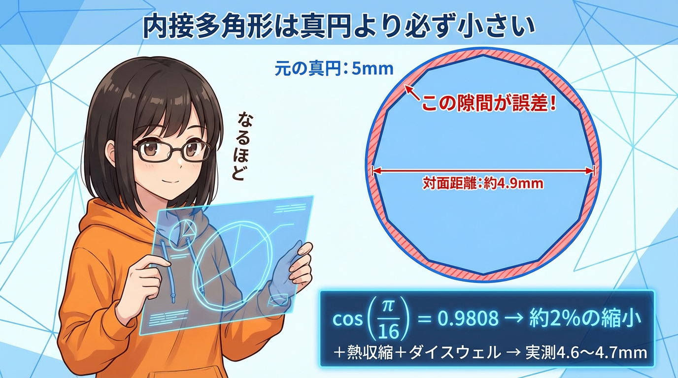 内接多角形の辺は、真円の「内側」を通ります。数学的に、直線は曲線より短い。だから多角形の「向かい合う面同士の距離」は、元の真円の直径より必ず小さくなる。