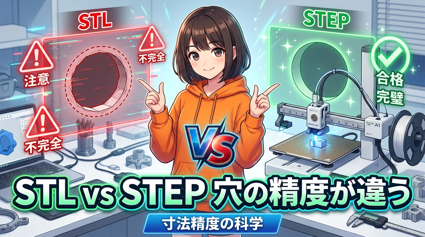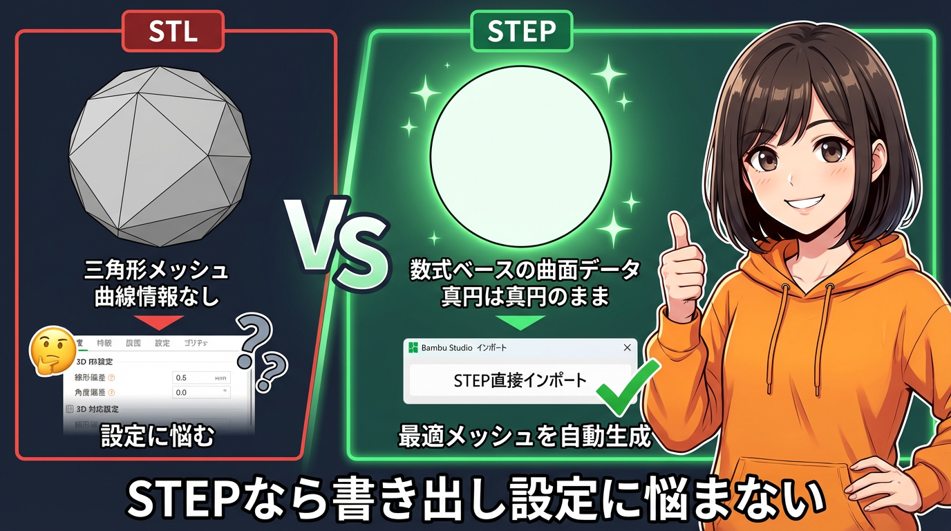 でも、ここが大きなメリット。従来はCAD側でSTLを書き出す時に「線形偏差」(linear deflection)や「角度偏差」(angle deflection)といったメッシュ分割精度の設定を自分で調整する必要がありました。粗すぎると穴が多角形になるし、細かすぎるとファイルが巨大になる。でもSTEPならBambu Studioが数式データから直接メッシュを生成してくれるので、その書き出し設定に悩む必要がなくなるんです!