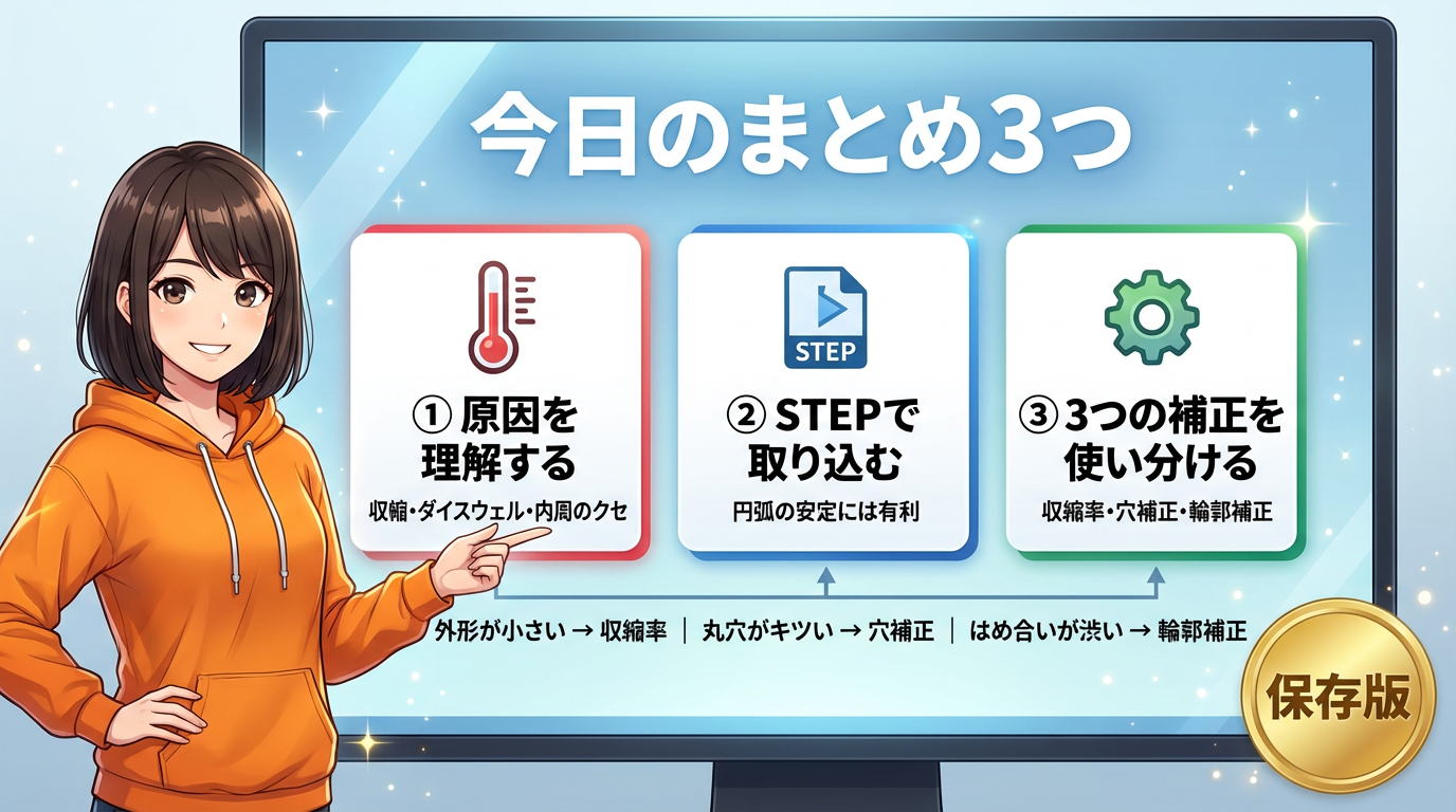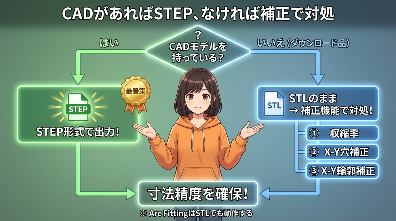 ② 形状精度、とくに円弧の安定には、可能ならSTEPで取り込むのが有利。ただし収縮や押し出し由来のズレは残る