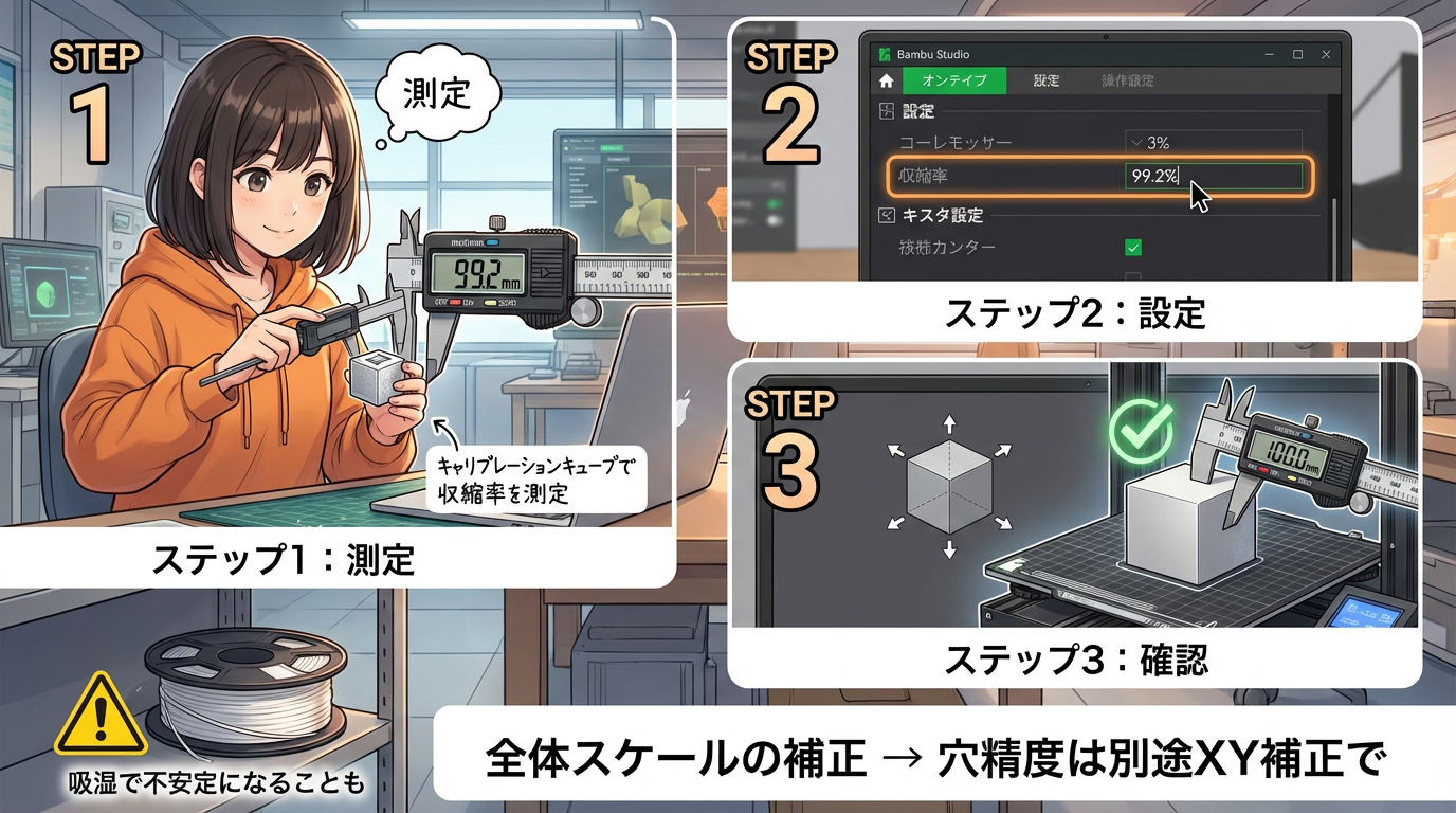 100mmのキャリブレーションキューブを印刷して、ノギスで測る。99.2mmだったら、設定に99.2%と入力。これは「出来上がりが設計の何%か」を入れるタイプの設定です。するとBambu Studioが自動でモデル全体を拡大してくれます。