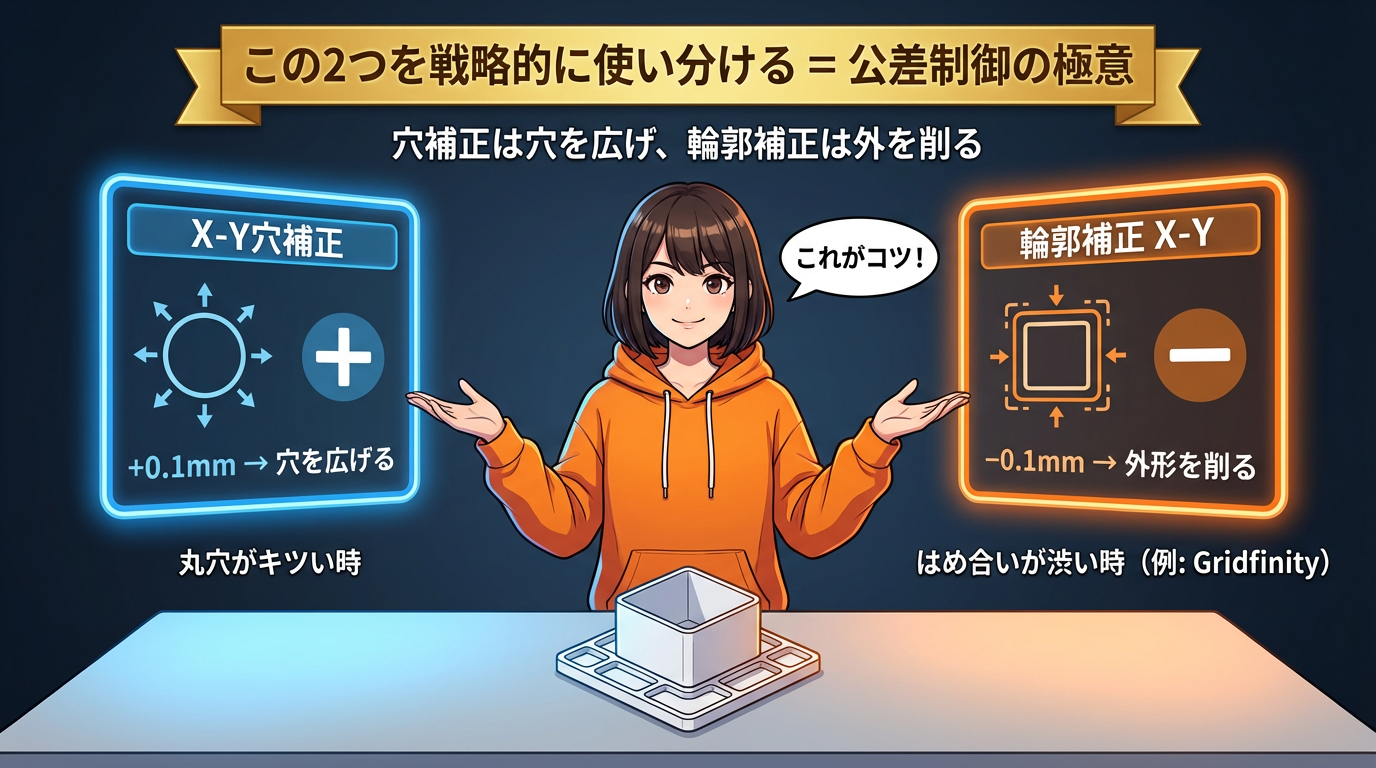 大事なポイントですが、これはあくまで「全体スケールの補正」です。穴の精度など、局所的な問題はこの次に紹介するXY補正で対処します🔧