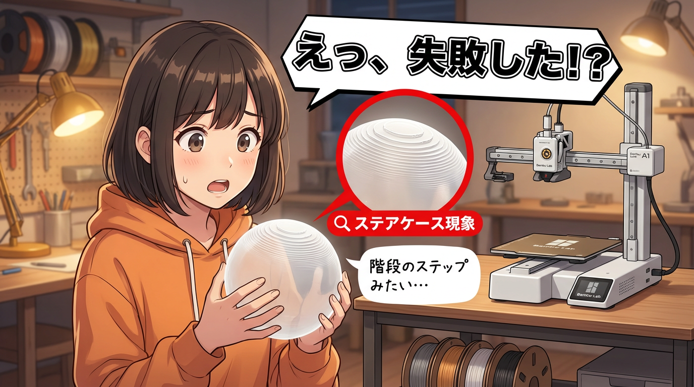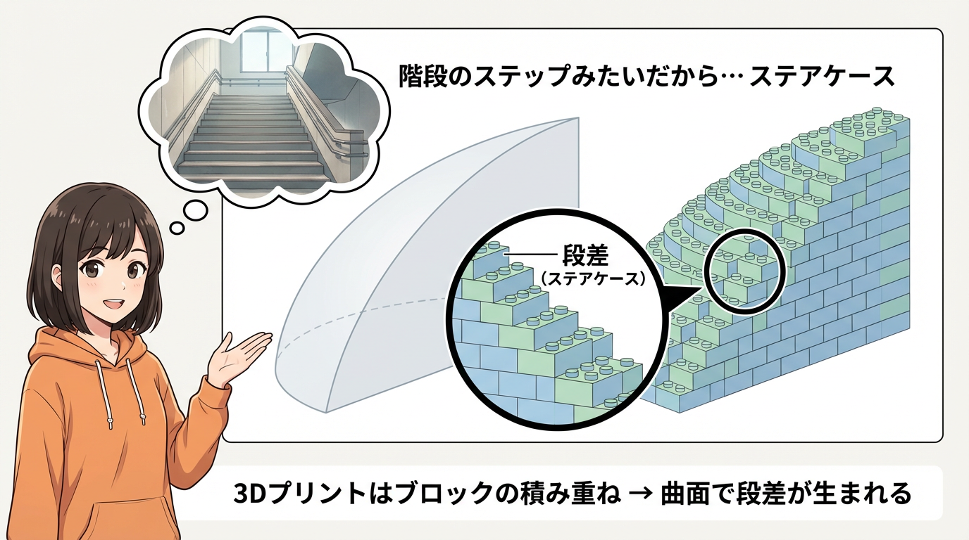 僕も最初にA1 miniで球体を刷ったとき、あまりにカクカクしていたので一瞬「これ失敗したのかな?」と思いました。でも実はこれ、設定ミスじゃなくて、FDMプリンター全般が持つ「積層の宿命」から来る現象なんです。名前は「ステアケース現象」。英語でStaircase Effectと呼ばれています。