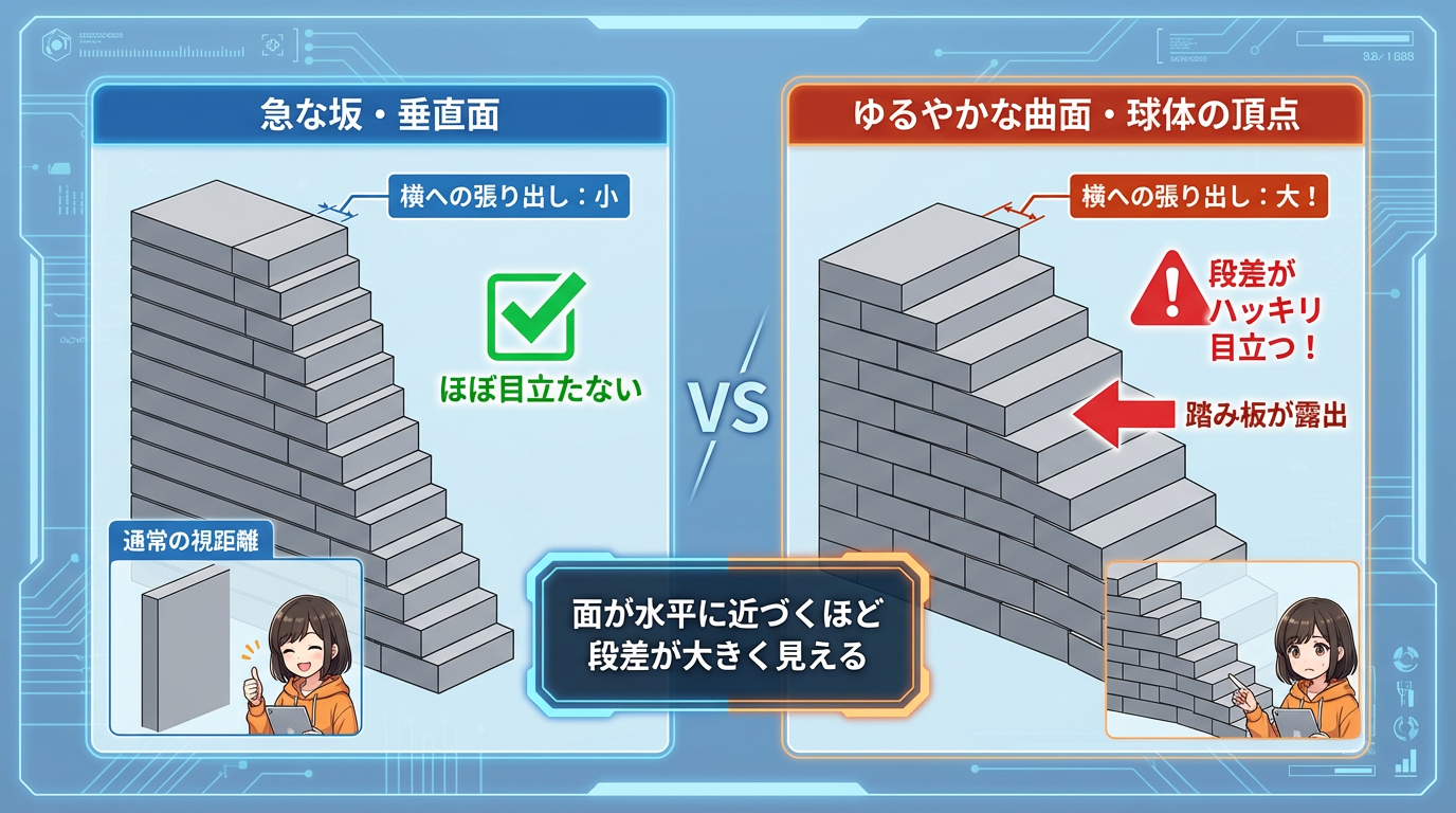 垂直に近い壁は目立たなくて、球体の頂点のような「ほぼ水平」な面ほど段差がハッキリ見える。これがステアケース現象の正体です。
