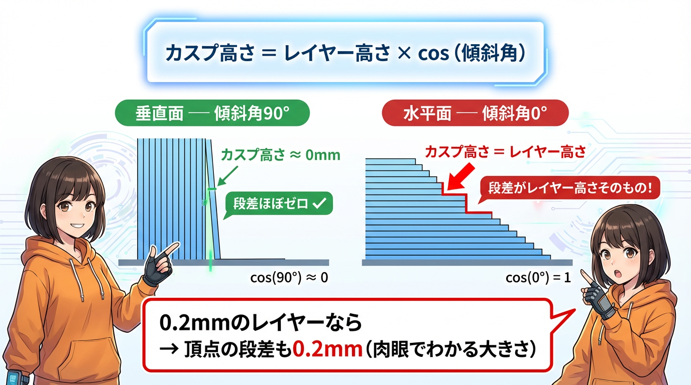 カスプ高さ = レイヤー高さ × cos(表面の傾斜角)