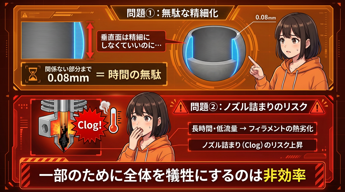 長時間、高温のプリントヘッドが同じ場所を行き来していると、フィラメントの熱劣化やノズル詰まりのリスクも高まります。一部のために全体を犠牲にする、明らかに非効率なやり方です。