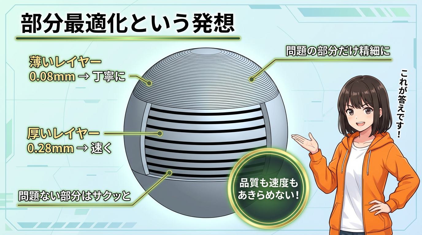 考え方はとってもスマートです。「曲面がゆるやかになっている頂点付近だけ薄いレイヤーで丁寧に積んで、垂直に近い壁面は厚いレイヤーで速く積む」という部分最適化のアプローチです。
