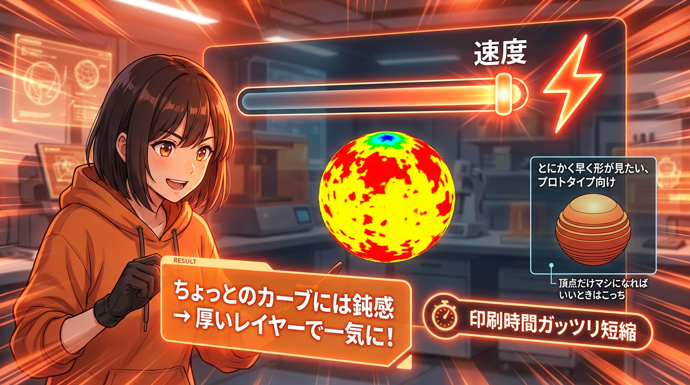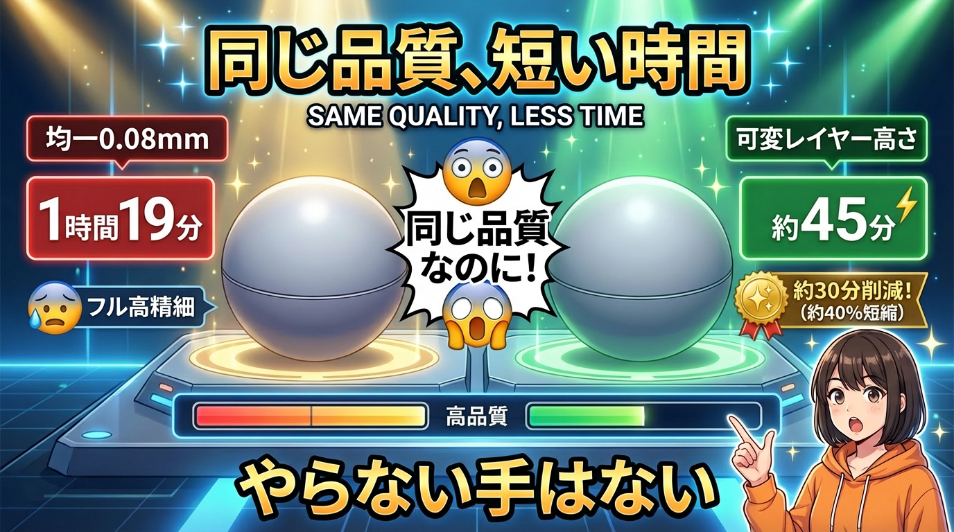 > 球体の頂点がカクカクするステアケース現象、全部薄くすると2.8倍の時間ロス。可変レイヤー高さを使えばカーブだけ精細、直線は高速。Bambu Studioのアダプティブモードで自動最適化できます。