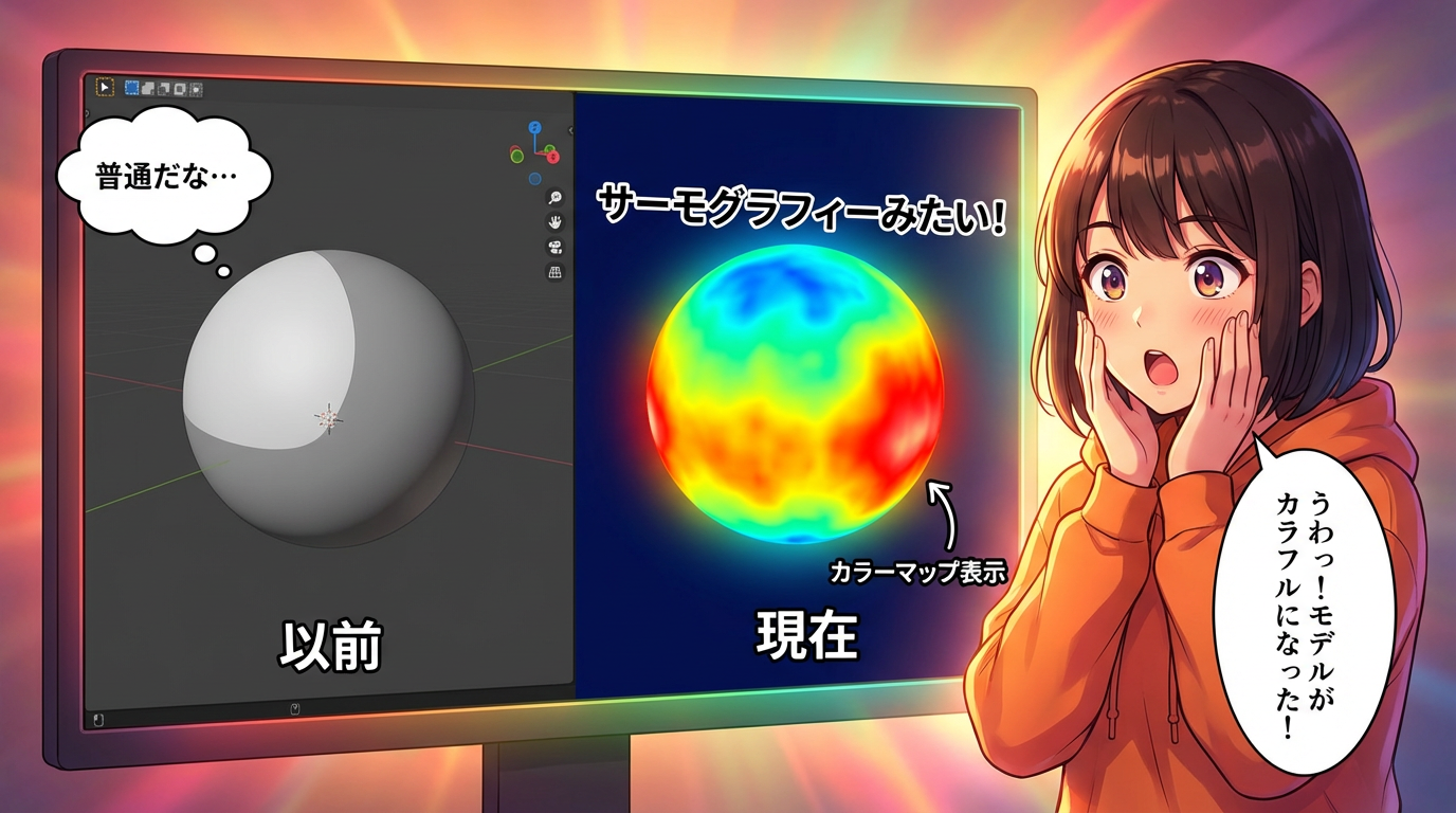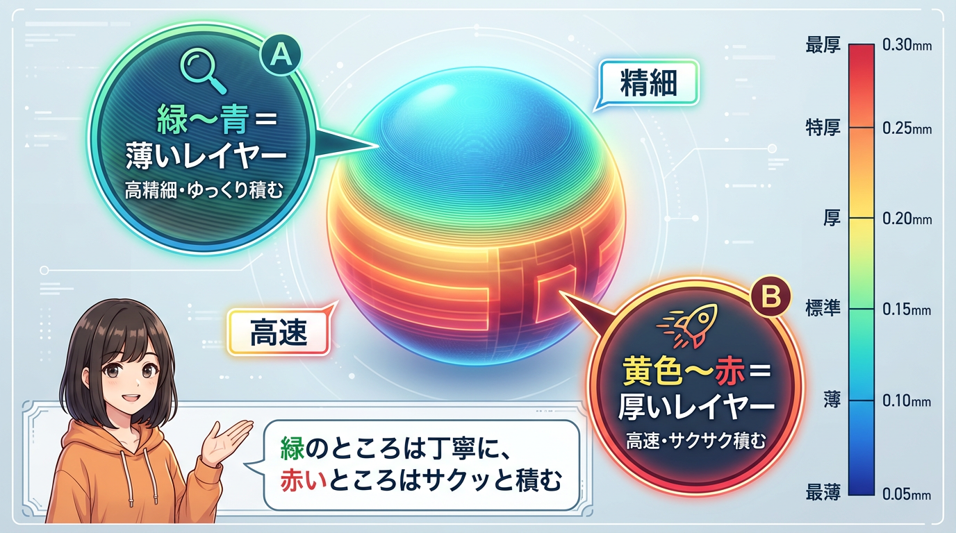 パネルが開くと同時に、3Dビュー上のモデル表面がサーモグラフィーのようなカラフルな色で塗られます。初めて見たとき「モデルがおかしくなった!」と驚くかもしれませんが、これが「この部分は今、どれくらいのレイヤー高さで積もうとしているか」を示すカラーマップです。