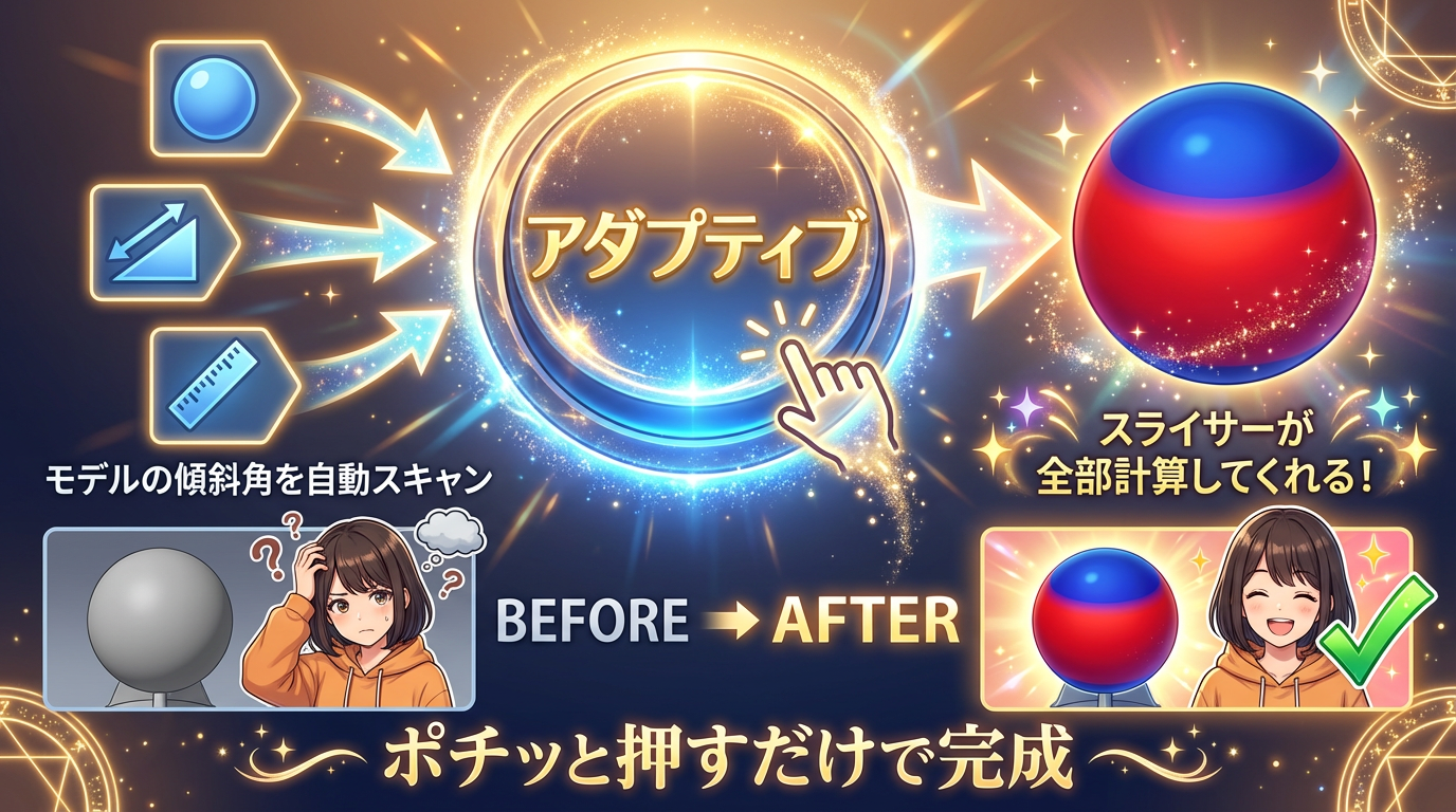 右パネルの「アダプティブ」ボタンを押すだけで、スライサーのアルゴリズムがモデルの傾斜角を自動計算して、各部分に最適なレイヤー高さを割り当ててくれます。
