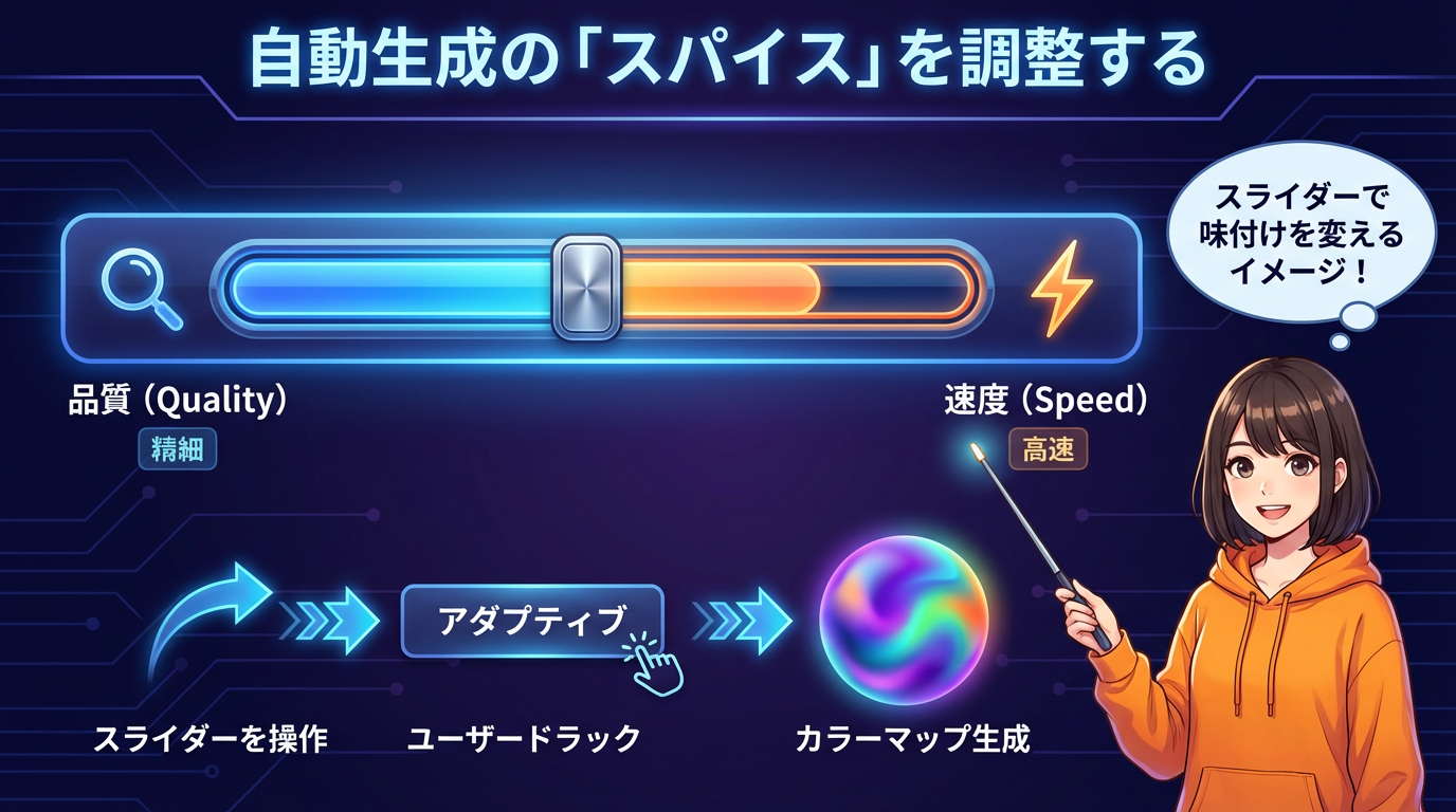 「アダプティブ」ボタンの下に「品質/速度」スライダーがあります。好みの位置に動かしてからアダプティブを押すと、自動生成の「細かさ vs 速さ」のバランスを変えられます。