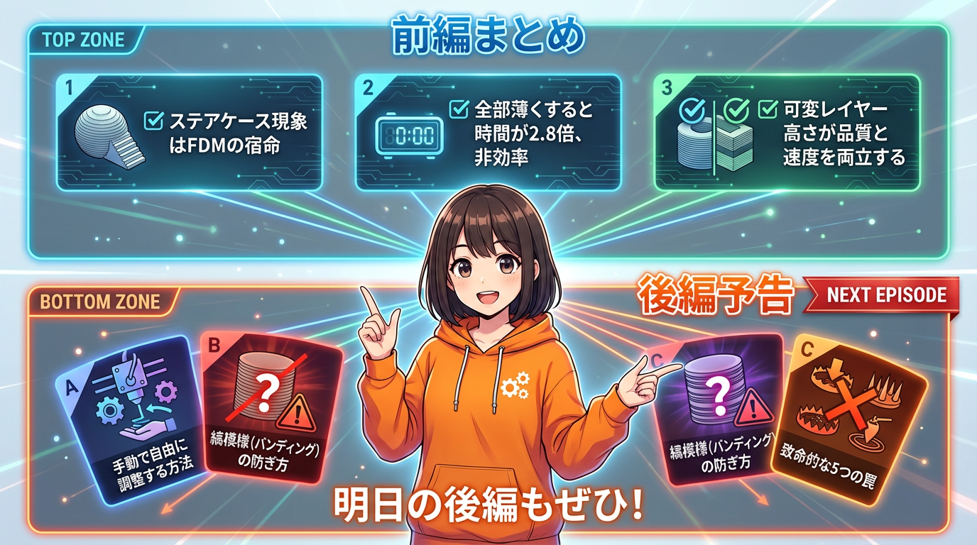 等高線のようなステアケース現象はFDMの宿命ですが、可変レイヤー高さを使えば「適材適所でレイヤーの厚さを変える」ことで品質と速度を高いレベルで両立できます。