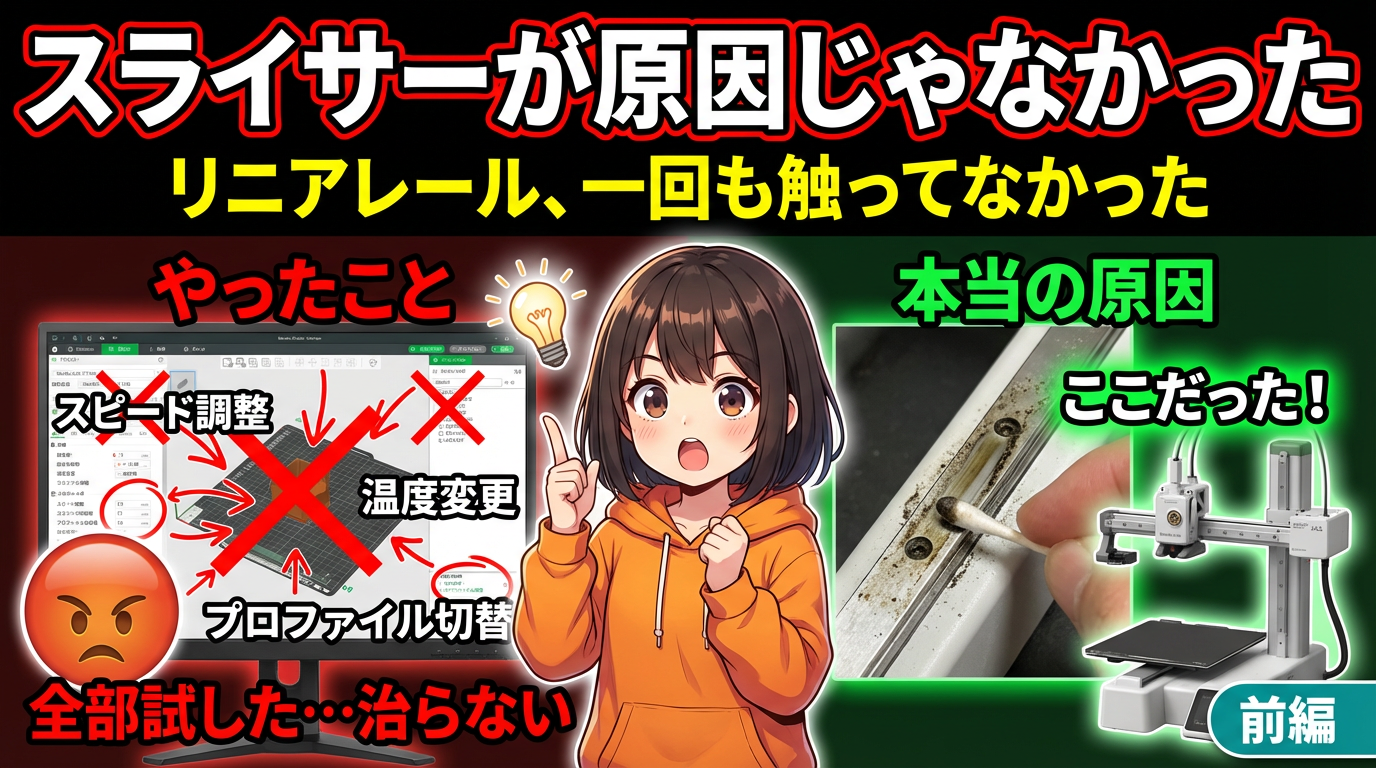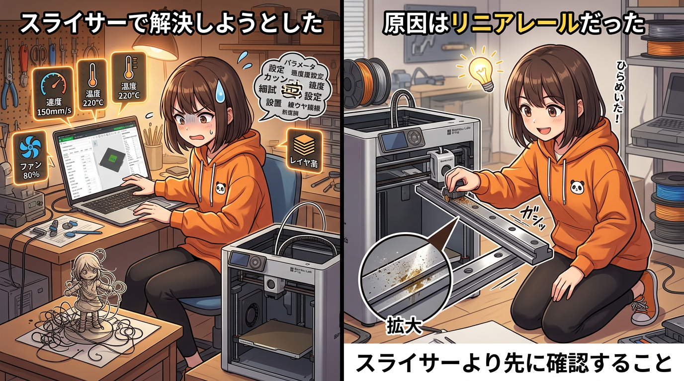 私も最初は「スピードを下げたら治るかも」「温度を少し変えたら?」とスライサーをいじりまくりました。全然治らない。あるとき「そういえばリニアレールって一回も掃除してないな」と気づいて、触ってみたらツールヘッドが動くときに明らかに引っかかりのある場所がある。