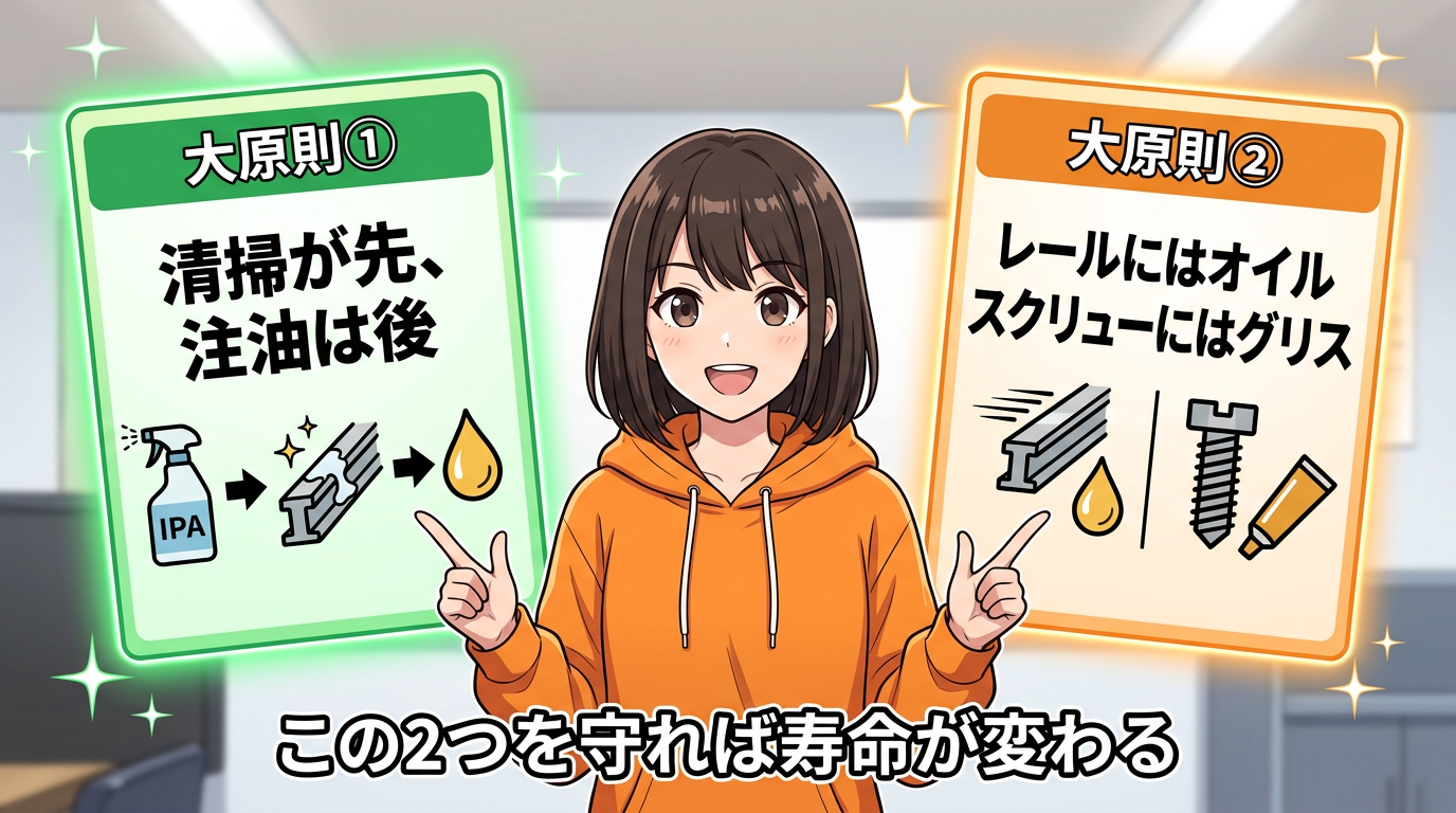 「清掃が先、注油は後」。そして「レールにはオイル、スクリューにはグリス」。