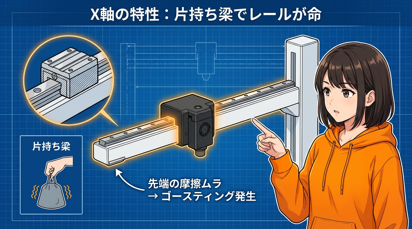 X軸はキャンチレバー構造——先端の摩擦ムラが命取り 🦾