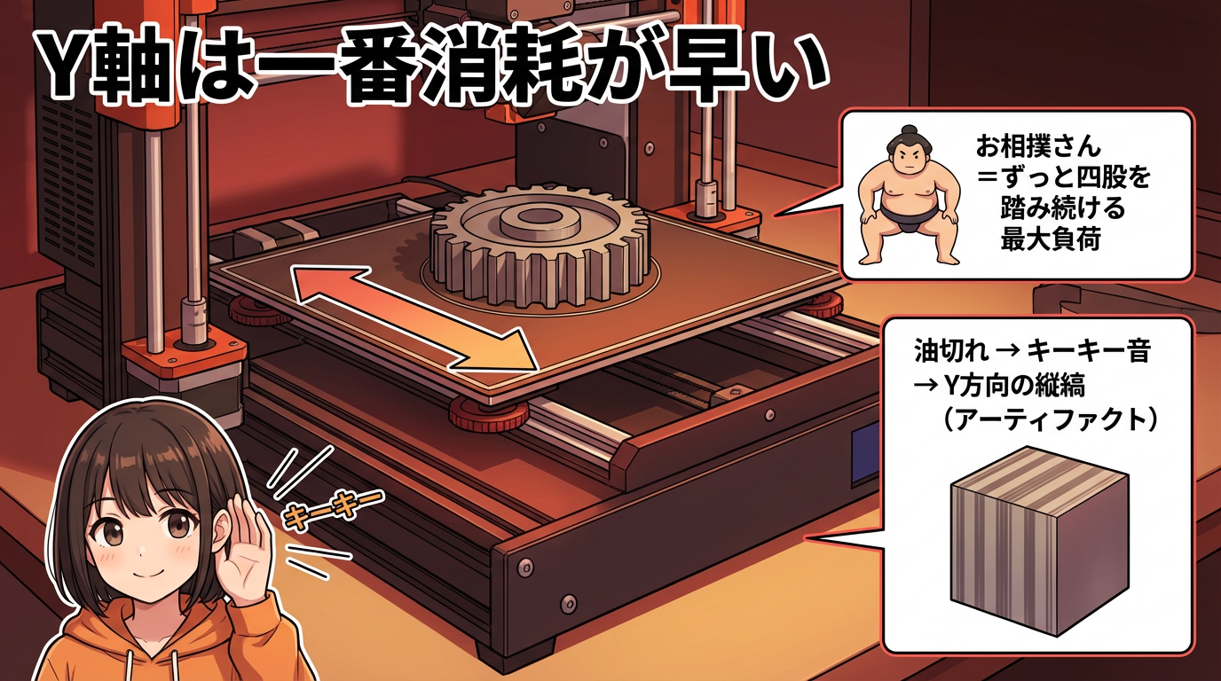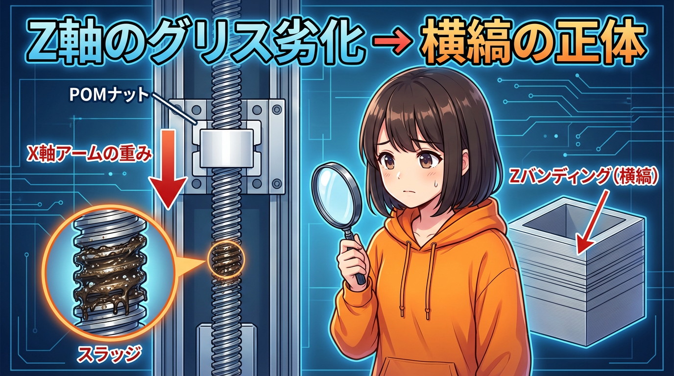 ここのグリスが劣化してスラッジ(泥状の汚れ)になると、Z軸の抵抗が不均一になって「Zバンディング(横縞)」という典型的な品質低下が発生します。