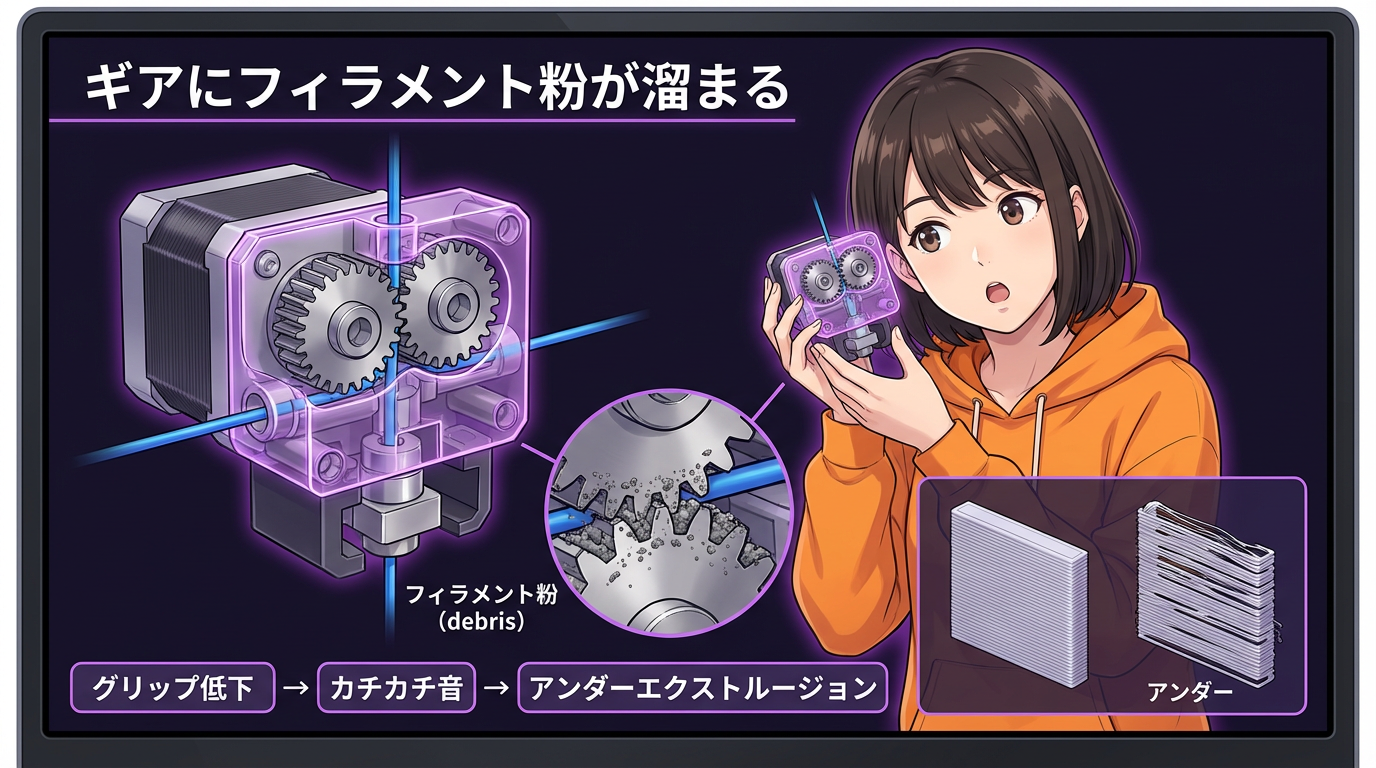 このギアにフィラメントカスが溜まってくると、グリップが落ちて「カチカチ」と音が出て、アンダーエクストルージョン(吐出不足)になります。