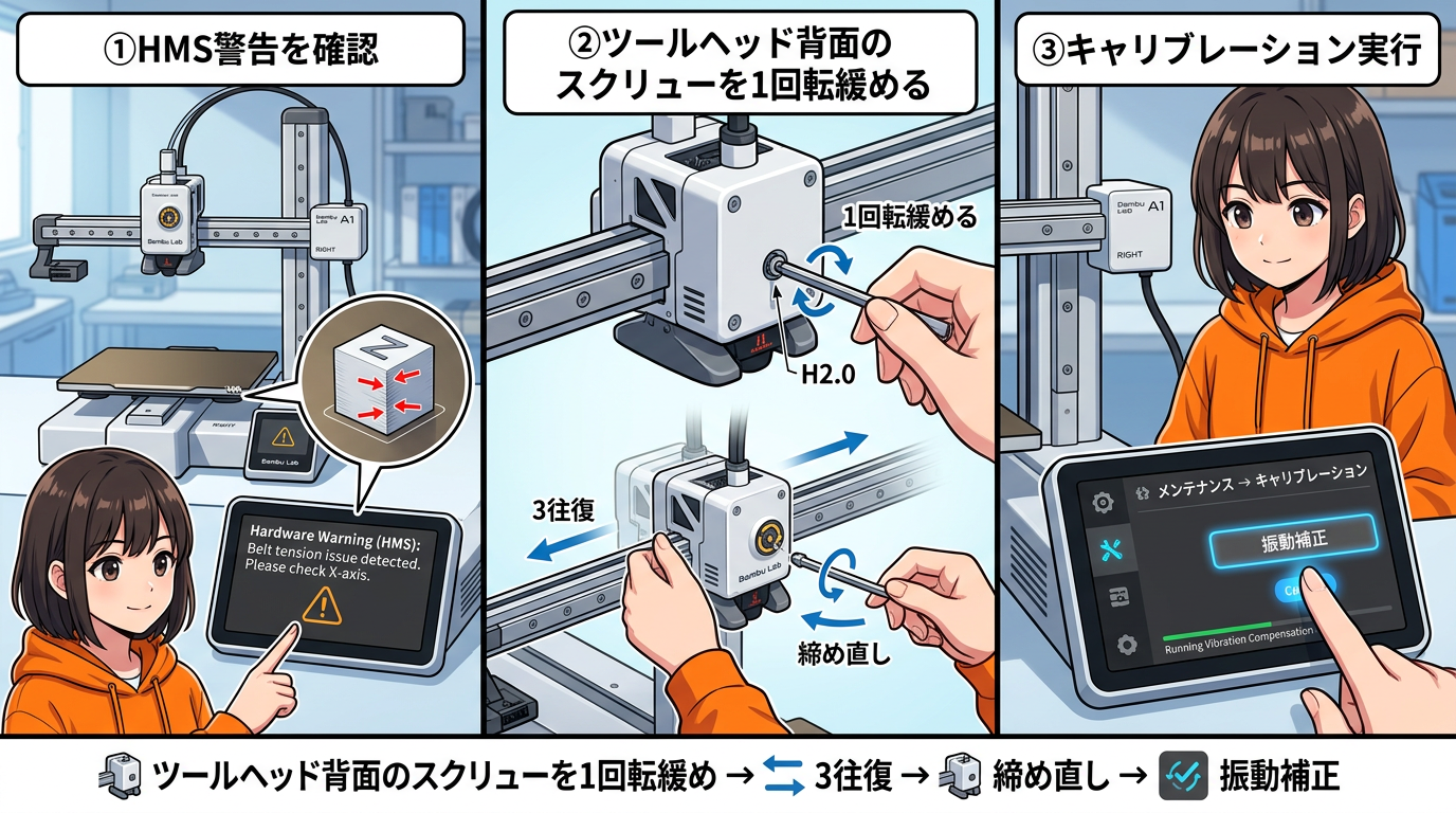そして大事なのが——ベルトを調整した後はそのまま印刷を始めないこと。必ず振動補正(Vibration Compensation)のキャリブレーションを再実行してください。これをしないと、かえって印刷品質が悪化することがあります。詳しくは後編で解説します。