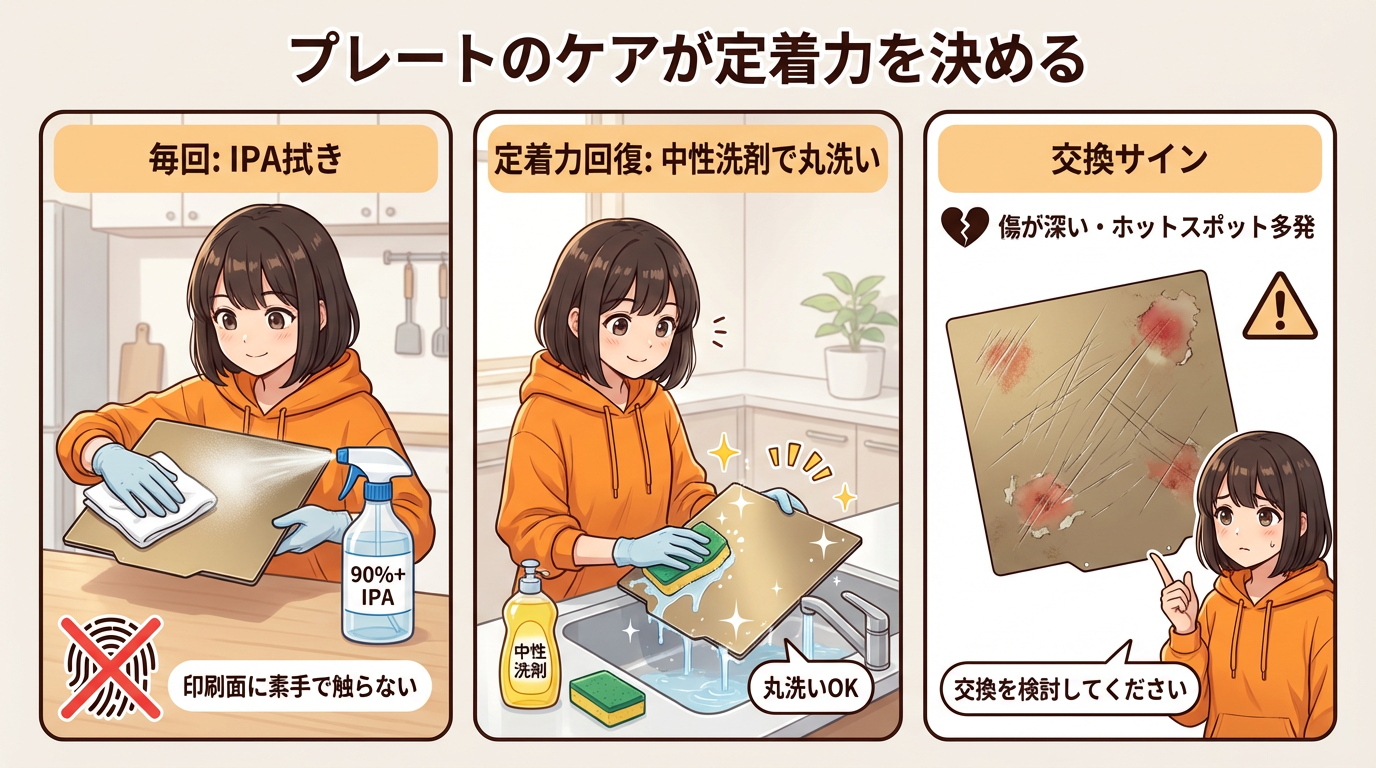 IPAでも定着力が戻らない場合は、プレートをシンクに持ち込んで、台所用の中性洗剤と温水でスポンジを使って丸洗いします。乾かしてセットしたら、ヒートベッドで加熱して完全に乾燥させる。これでPEI本来の定着力が新品に近いレベルに回復します。