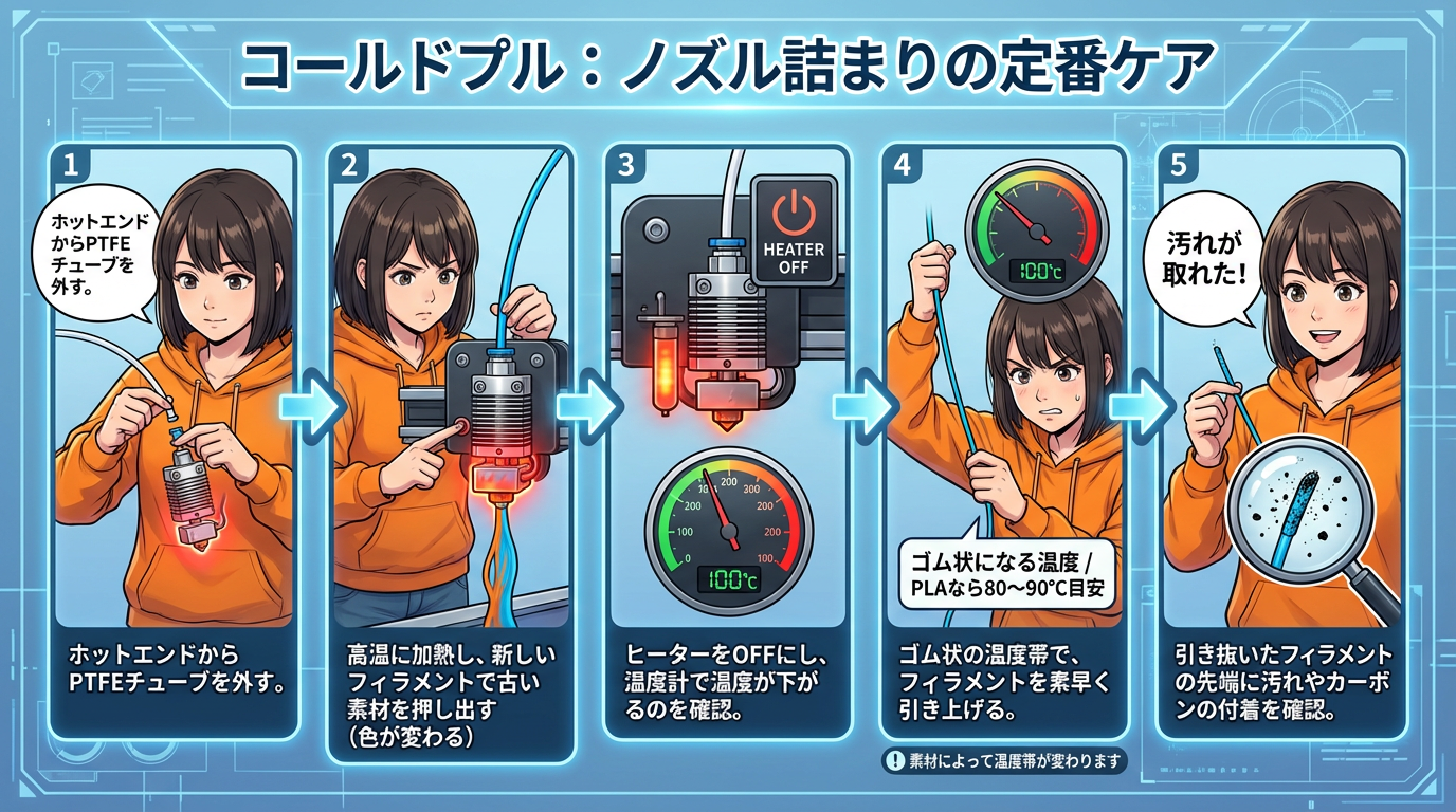 ノズル内部に汚染物質が蓄積すると、出力不良(詰まり)や部分的な詰まり(パーシャルクロッグ)の原因になります。これを物理的に排除する方法が「コールドプル(Cold Pull)」です。
