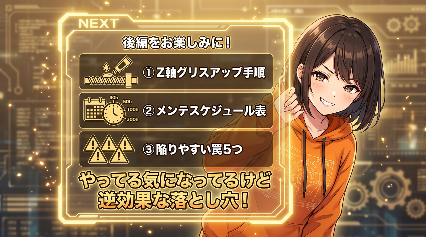 前編では「各軸の仕組みと摩耗ポイント」と「ビルドプレート・ノズル・リニアレール・ベルトテンション」のメンテを、後編では「Z軸グリスアップ・メンテスケジュール・やりがちな罠5つ」をお届けします。