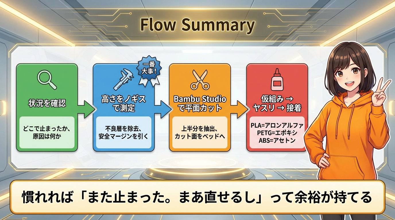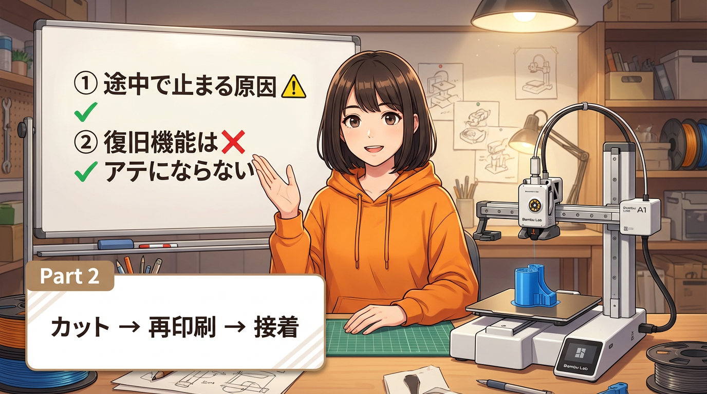 今日一番伝えたかったのは「途中で印刷が止まっても、諦めなくていい」ってことです。数十時間かけた印刷物を丸ごとゴミ箱に捨てるのは、フィラメント代ももったいないし、何より精神的にキツい。