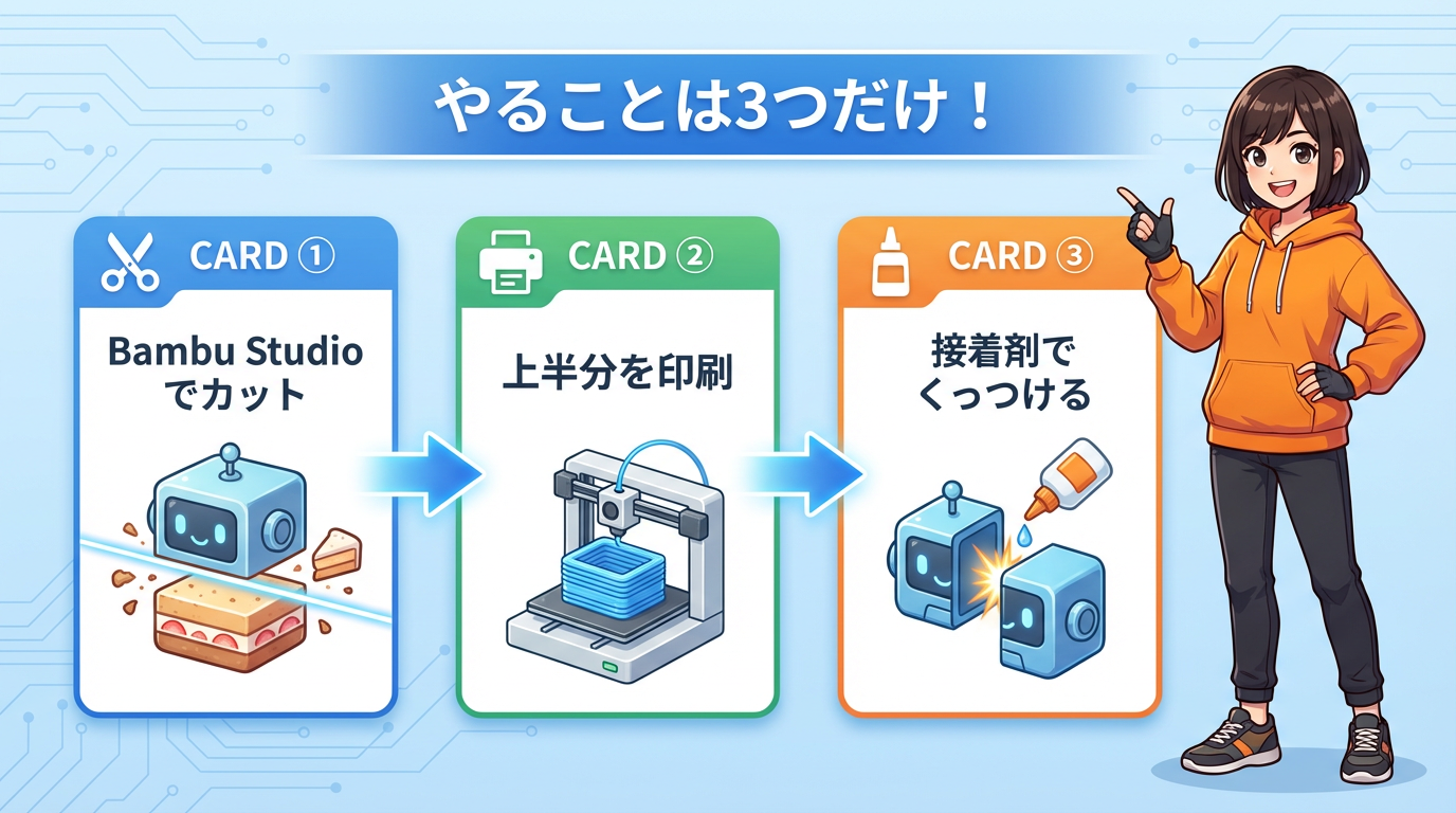 ざっくり言うと、やることはシンプル。「止まったところから上だけを、もう1回印刷して、接着剤でくっつける」。これだけなんですよ。