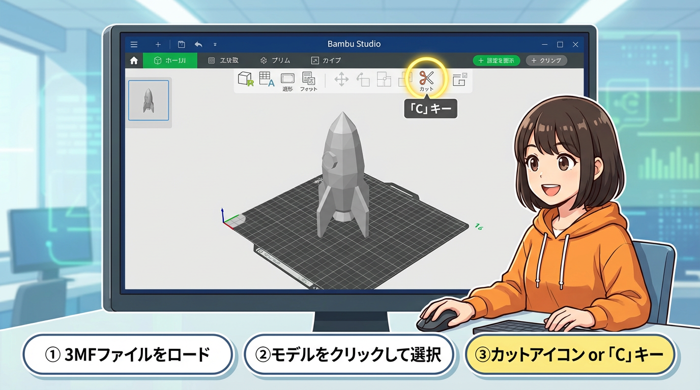 そのモデルをクリックして選択した状態で、画面上のツールバーにある「カット」アイコンをクリック。キーボードの「C」キーを押しても同じです。これで「カットモード」に入ります。