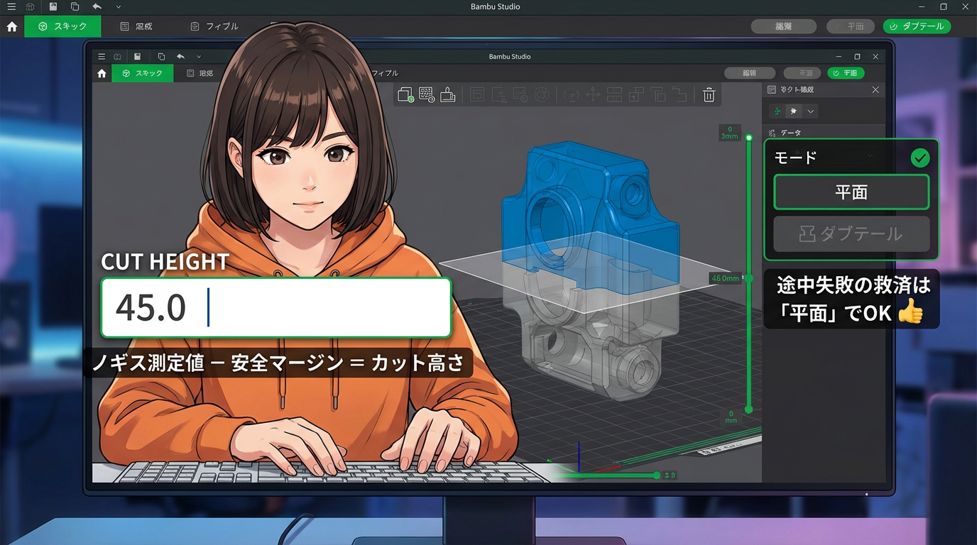 ① Bambu Studioで元のデータを「ここから上だけ」って切る。ケーキをナイフで水平にスライスするイメージですね。