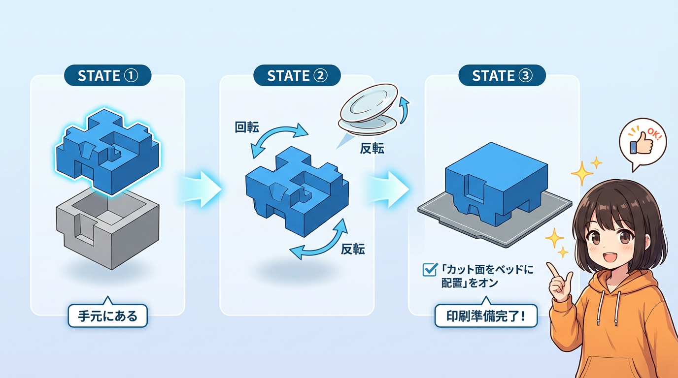 ここで大事な設定があって、「カット面をベッドに配置」っていうオプションをオンにしてください。これは切った上半分のパーツを、切り口が下になるようにひっくり返して、ベッド(印刷台)にペタッと置いてくれる機能です。お皿をひっくり返して置くイメージですね。