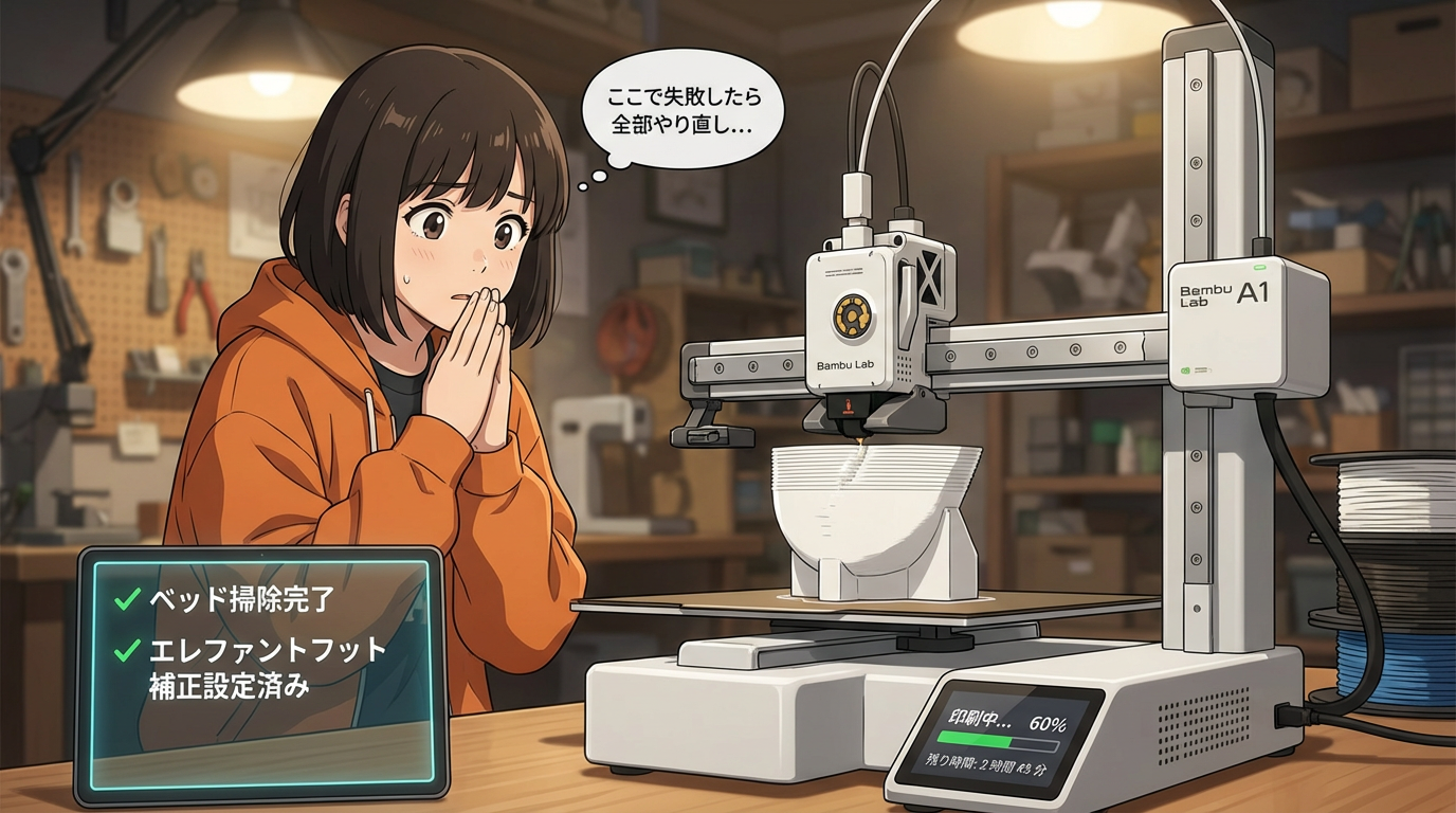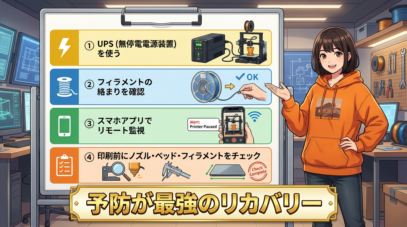ここまで「失敗したものを復活させる方法」を話してきましたけど、本音を言うと「そもそも失敗しないのが一番」ですよね。特に長時間の印刷を始める前に、いくつかチェックしておくと安心です。