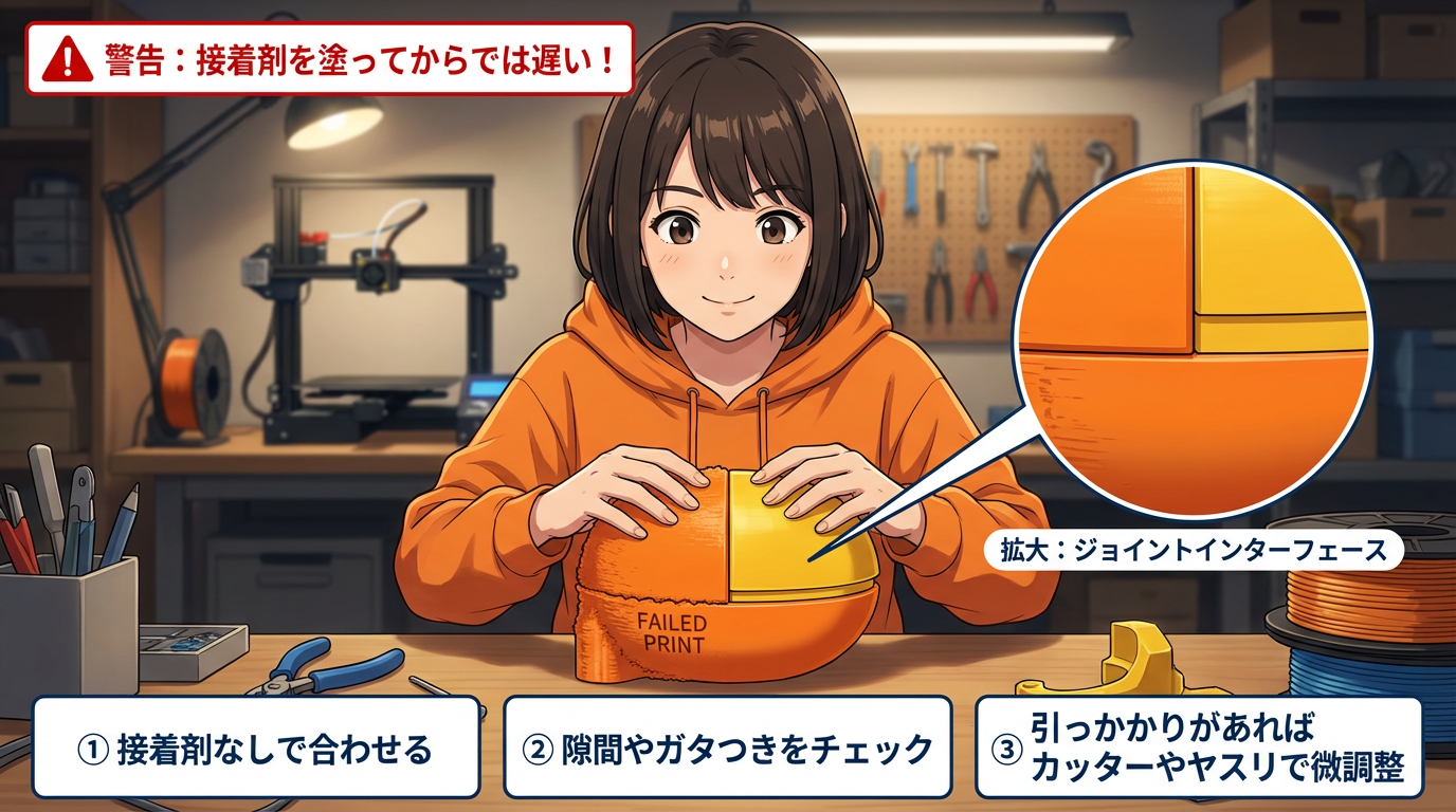 上半分のパーツが印刷できたら、やりがちなのが「よし、すぐ接着剤を塗ろう!」って焦ること。ちょっと待ってください。まず「接着剤なし」で、上と下を合わせてみてください。