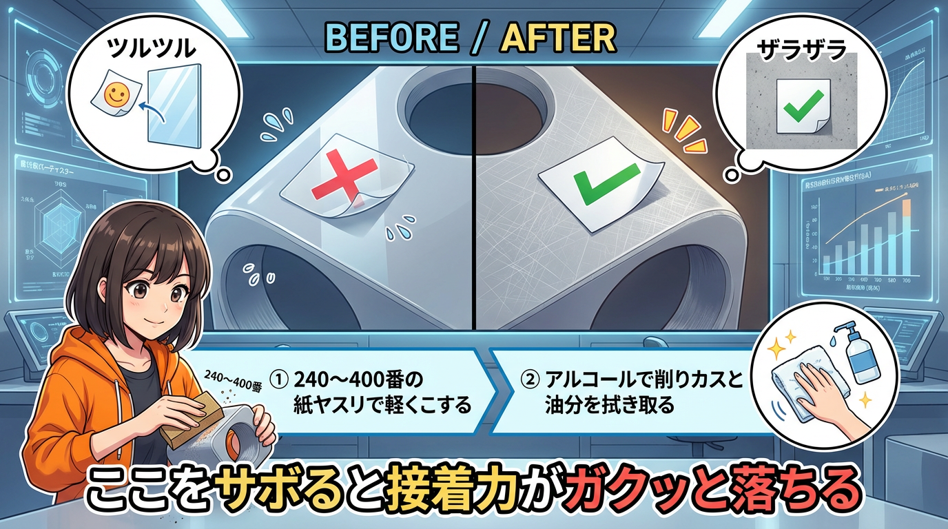 例えるなら、ツルツルのガラスにシールを貼るより、ちょっとザラザラした壁にシールを貼るほうがしっかりくっつきますよね。あれと同じ原理です。表面に細かい傷がつくことで、接着剤が入り込む面積が増えて、ガッチリくっつく。