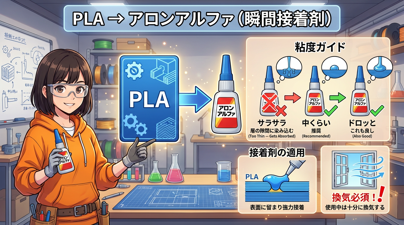 PLAには「瞬間接着剤」が一番相性がいいです。商品名で言うと「アロンアルファ」ですね。空気中の水分に反応して一瞬で固まるので、すぐくっつく。